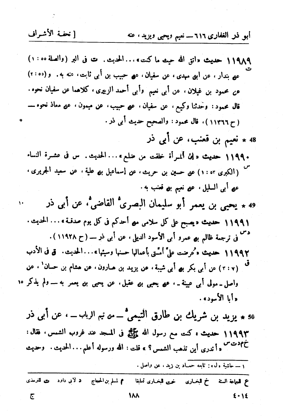 ت في البر (والصلة 55: 1) عن بندار، عن ابن مهدي، عن سفيان، عن حبيب بن أبي ثابت، عنه به و (55: 2) عن محمود بن غيلان، عن أبي نعيم وأبي أحمد الزبيري، كلاهما عن سفيان نحوه. قال محمود: وحدثنا وكيع، عن سفيان، عن حبيب، عن ميمون، عن معاذ نحوه - (ح 11366) ، قال محمود: والصحيح حديث أبي ذر.