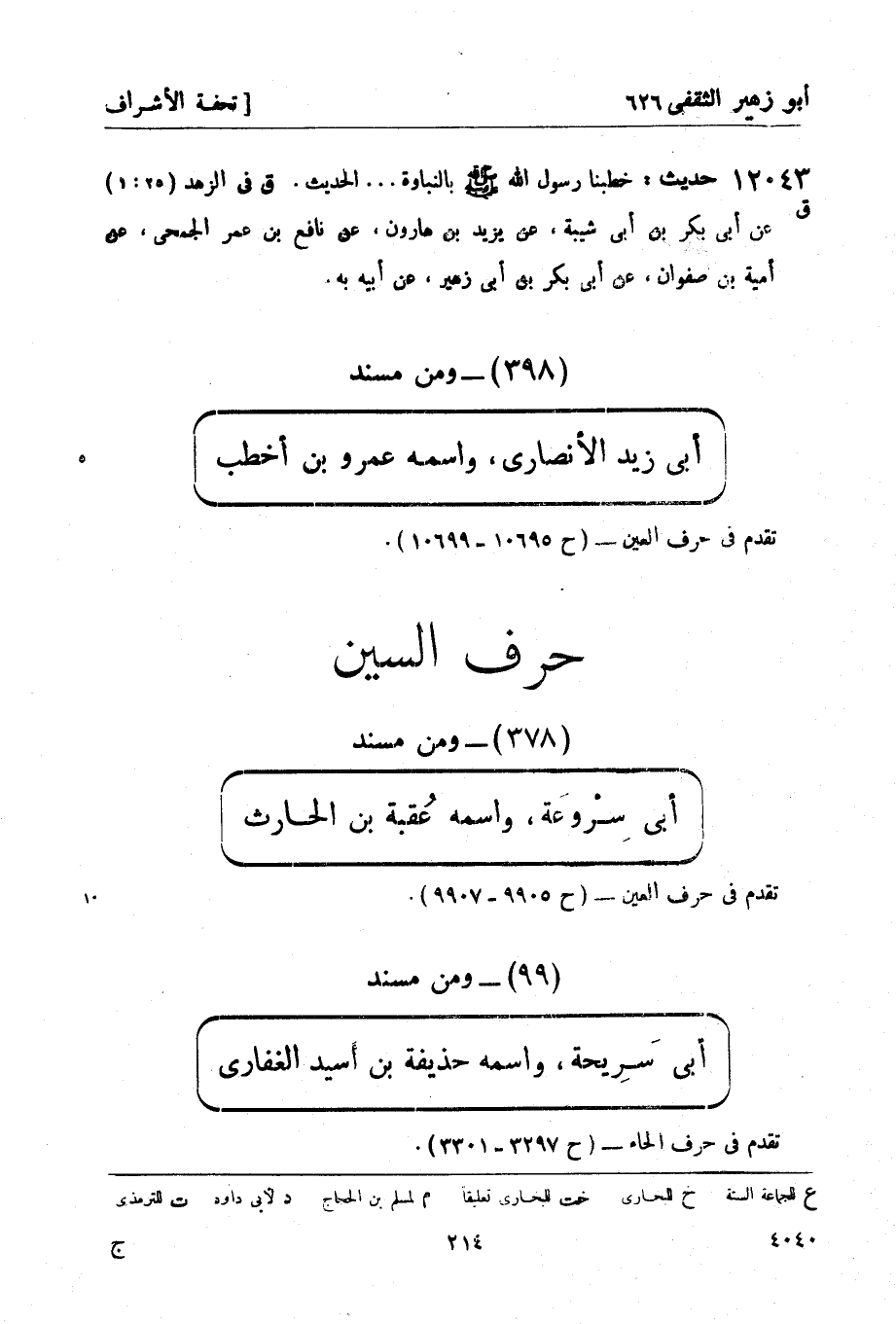 ومن مسند أبي سَرِيحة، واسمه حذيفة بن أُسيد الغفاري تقدم في حرف الحاء - (ح 3297 - 3301) .