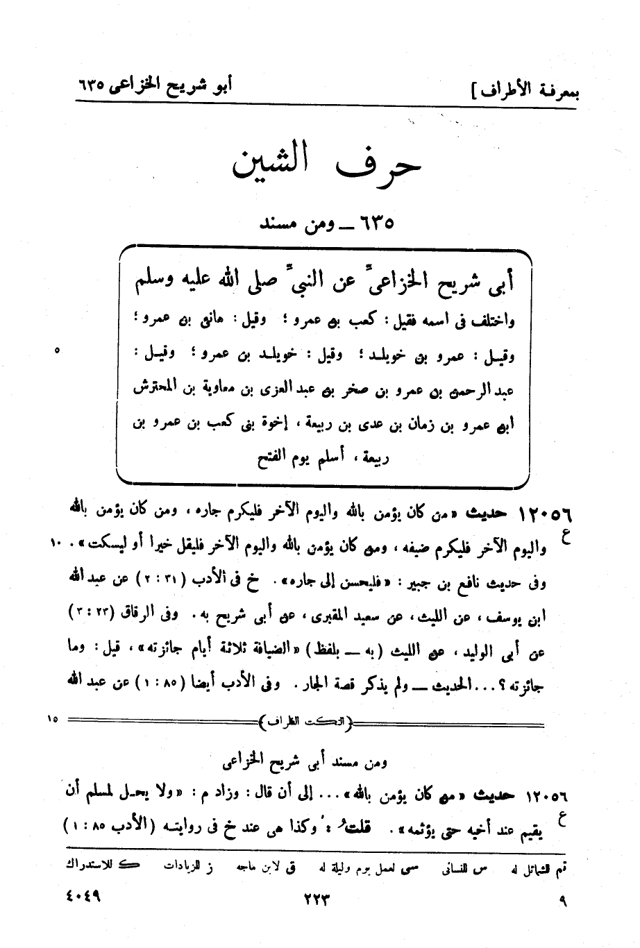 ومن مسند أبي شريح الخزاعيِّ، عن النبيِّ صَلَّى اللَّهُ عَلَيْهِ وَسَلَّمَ واختلف في اسمه فقيل: كعب بن عمرو؛ وقيل: هانئ بن عمرو؛ وقيل: عمرو بن خويلد؛ وقيل: خويلد بن عمرو؛ وقيل: عبد الرحمن بن عمرو بن صخر بن عبد العزى بن معاوية بن المحترش بن عمرو بن زمان بن عدي بن ربيعة، إخوة بني كعب بن عمرو بن ربيعة، أسلم يوم الفتح.
