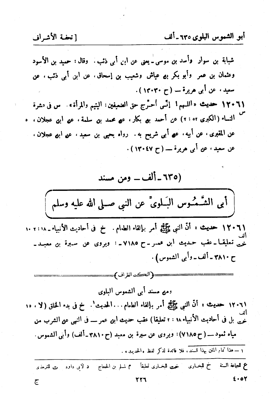 12061 - (ألف خت) حديث: أنّ النبي صَلَّى اللَّهُ عَلَيْهِ وَسَلَّمَ أمر بإلقاء الطعام. (خ) في أحاديث الأنبياء - (18: 2) تعليقاً - عقب حديث ابن عمر - ح 7185: ويروى عن سبرة بن معبد - ح 3810 - ألف - وأبي الشموس) .