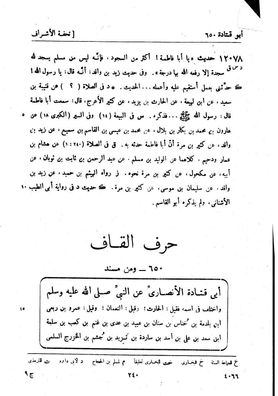 12078 -[د س ق] حديث يا أبا فاطمة! أكثر من السجود فإنَّه ليس من مسلم يسجد لله سجدة إلا رفعه الله بها درجة. وفي حديث زيد بن واقد: أنَّه قال: يا رسول الله! حدِّثني بعمل أستقيم عليه وأعمله ... الحديث (ك)