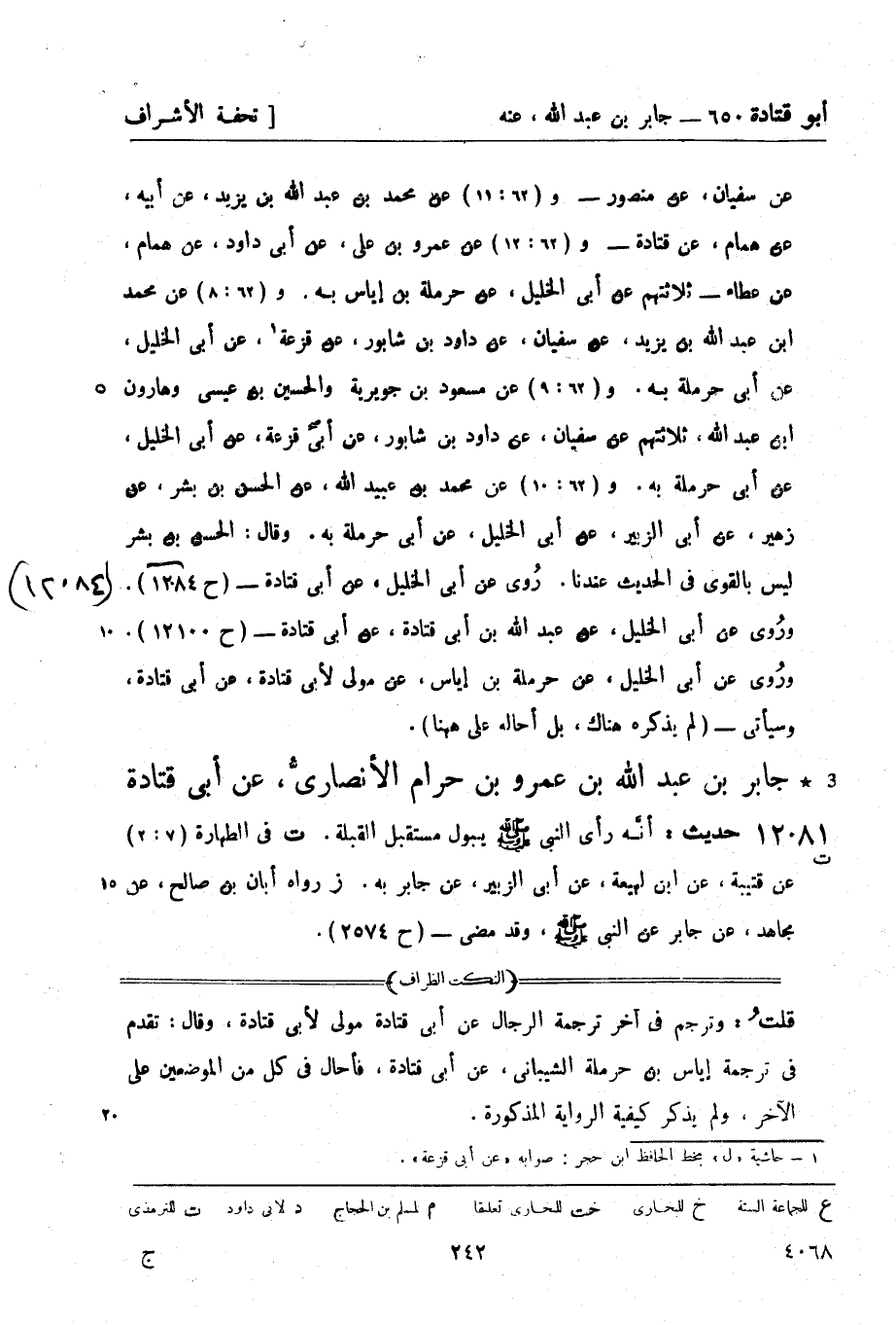 12081 -[ت] حديث: أنَّه رأى النبي صَلَّى اللَّهُ عَلَيْهِ وَسَلَّمَ يبول مستقبل القبلة. (ت) في الطهارة (7: 2) ، عن قتيبة، عن ابن لهيعة، عن أبي الزبير، عن جابر به. (ز) رواه أبان بن صالح، عن مجاهد، عن جابر عن النبي صَلَّى اللَّهُ عَلَيْهِ وَسَلَّمَ، وقد مضى - (ح 2574) .