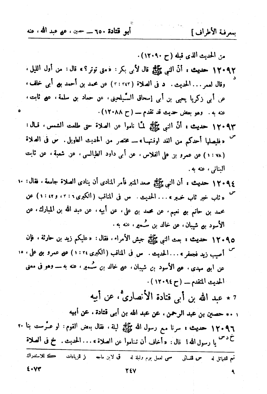 د في الصلاة (343: 3) عن محمد بن أحمد بن أبي خلف، عن أبي زكريا يحيى بن أبي إسحاق السَّيلحيني، عن حماد بن سلمة، عن ثابت، عنه به. وهو بعض حديث قد تقدم - (ح 12088) .