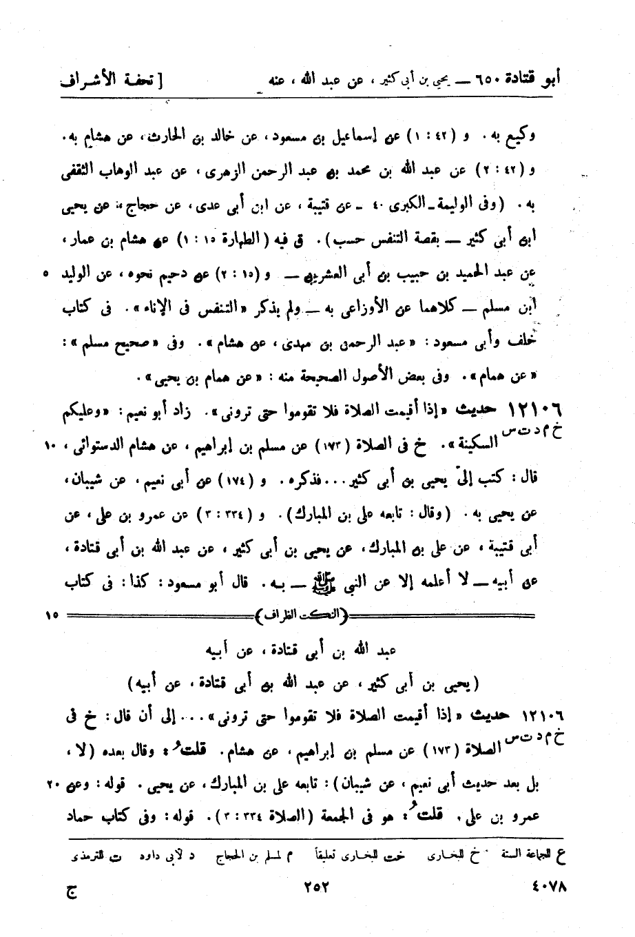 12106 -[خ م د ت س] حديث إذا أقيمت الصلاة فلا تقوموا حتى تروني. زاد أبو نعيم: وعليكم السكينة. (خ) في الصلاة (173) عن مسلم بن إبراهيم، عن هشام الدستوائي، قال: كتب إليّ يحيى بن أبي كثير ... فذكره و (174) عن أبي نعيم، عن شيبان، عن يحيى به (وقال: تابعه علي بن المبارك) و (334: 3) عن عمرو بن علي، عن أبي قتيبة، عن علي بن المبارك، عن يحيى بن أبي كثير، عن عبد الله بن أبي قتادة، عن أبيه - لا أعلمه إلا عن النبي صَلَّى اللَّهُ عَلَيْهِ وَسَلَّمَ - به. قال أبو مسعود: كذا: في كتاب -[253]- الفربري، وفي كتاب حماد بن شاكر عن البخاري: عن عبد الله بن أبي قتادة أراه عن أبيه.