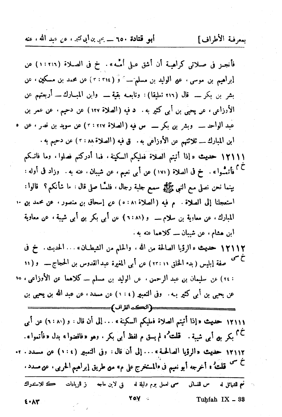 خ في صفة إبليس (بدء الخلق 11: 23) عن أبي المغيرة عبد القدوس بن الحجاج - و (11: 24) عن سليمان بن عبد الرحمن، عن الوليد بن مسلم - كلاهما عن الأوزاعي، عن يحيى بن أبي كثير به. وفي التعبير (4: 1) عن مسدد، عن عبد الله بن يحيى بن -[258]- أبي كثير، عن أبيه، عن أبي سلمة بن عبد الرحمن (ح 12135) وعبد الله بن أبي قتادة، كلاهما عن أبي قتادة به.