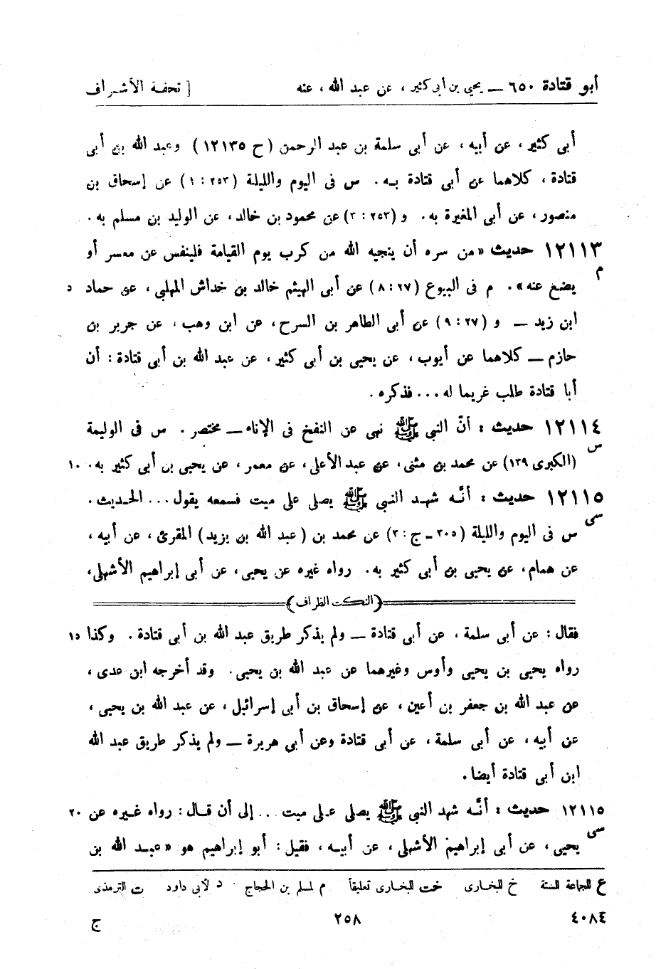 س في اليوم والليلة (305 - ج: 2) عن محمد بن (عبد الله بن يزيد) المقرئ، عن أبيه، عن همام، عن يحيى بن أبي كثير به. رواه غيره عن يحيى، عن أبي إبراهيم الأشهلي، -[259]- عن أبيه (ح 15687) عن النبيّ صَلَّى اللَّهُ عَلَيْهِ وَسَلَّمَ، فقيل: أبو إبراهيم هو عبد الله بن أبي قتادة، وذلك بعيد؛ لأنه سلمى، وليس بأشهلي. ورُوي عن يحيى، عن أبي سلمة، عن عائشة - (ح 17790) . وروي عن يحيى، عن أبي سلمة - مرسل.