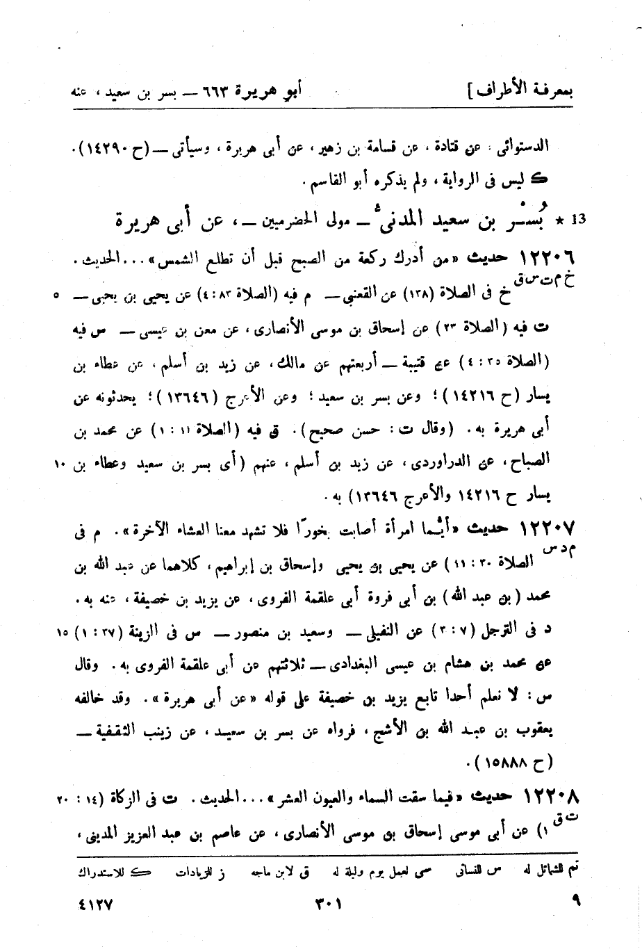 س فيه (الصلاة 35: 4) عن قتيبة - أربعتهم عن مالك، عن زيد بن أسلم، عن عطاء بن يسار (ح 14216) ؛ وعن بسر بن سعيد؛ وعن الأعرج (13646) ؛ يحدثونه عن أبي هريرة به. (وقال ت: حسن صحيح) .