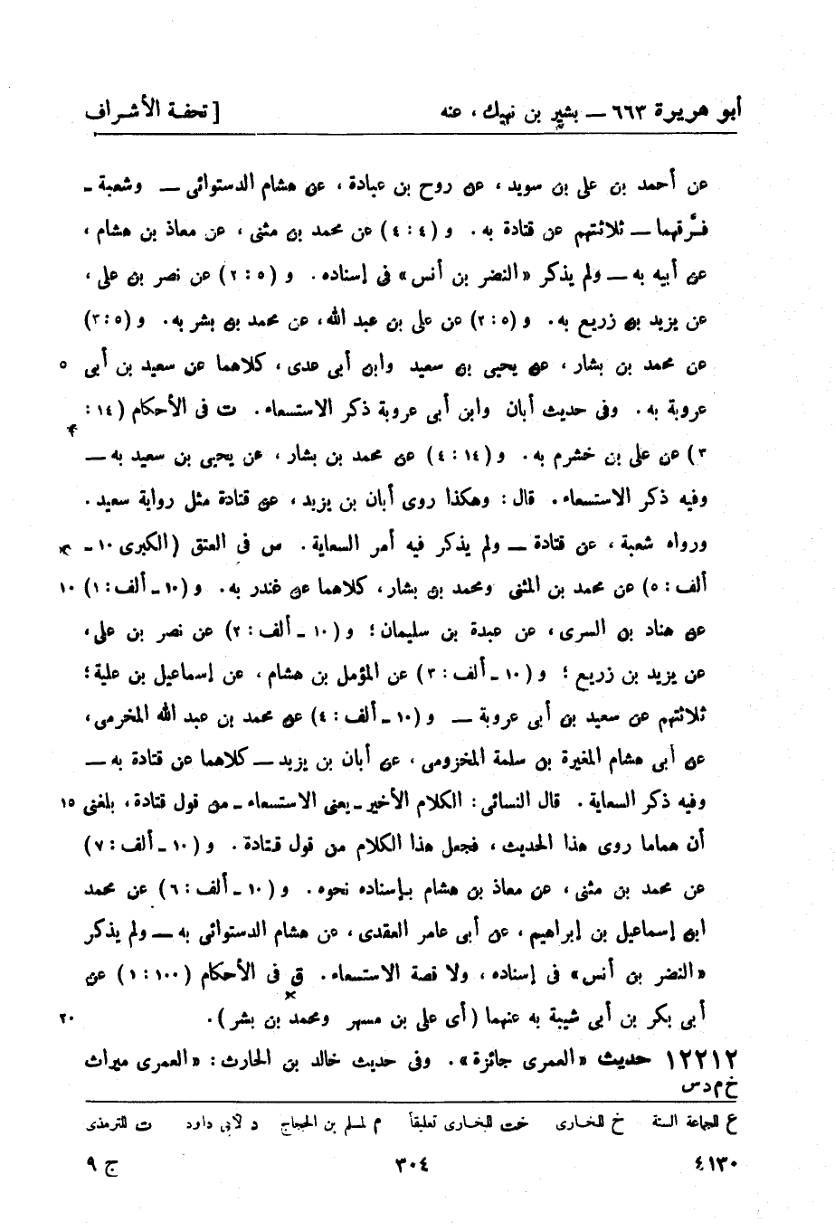 م في الفرائض (بل في الهبات 4: 15) عن محمد بن المثنى ومحمد بن بشار، كلاهما عن غندر، عن شعبة - و (4: 16) عن يحيى بن حبيب بن عربي، عن خالد بن الحارث، عن سعيد - ثلاثتهم عن قتادة، عن النضر بن أنس، عن بشير بن نهيك به.