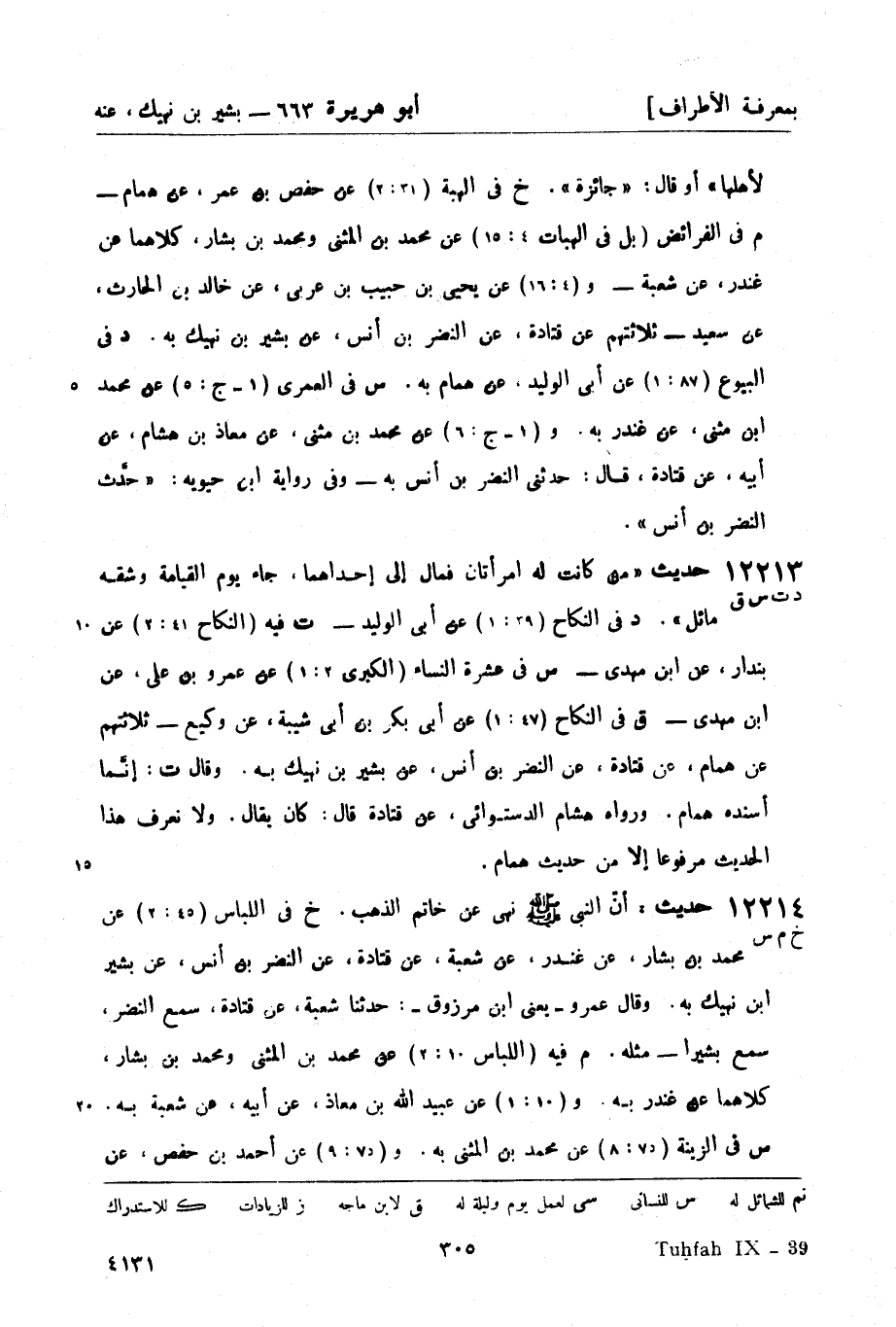 س في الزينة (75: 8) عن محمد بن المثنى به. و (75: 9) عن أحمد بن حفص، عن -[306]- أبيه، عن إبراهيم بن طهمان، عن حجاج بن حجاج، عن قتادة، عن عبد الملك بن عبيد، عن بشير بن نهيك به. وقال: حديث شعبة أولى بالصواب.
