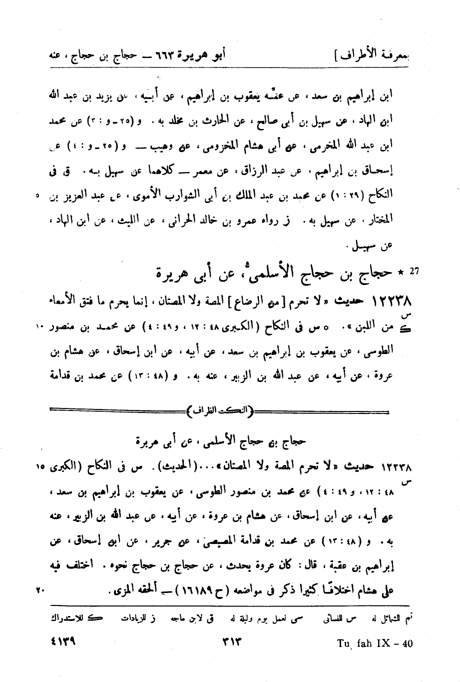 س في النكاح (الكبرى 48: 12 و49: 4) عن محمد بن منصور الطوسي، عن يعقوب بن إبراهيم بن سعد، عن أبيه، عن ابن إسحاق، عن هشام بن عروة، عن أبيه، عن عبد الله بن الزبير، عنه به. و (48: 13) عن محمد بن قدامة -[314]- المصيصي، عن جرير، عن ابن إسحاق، عن إبراهيم بن عقبة، قال: كان عروة يحدث، عن حجاج بن حجاج نحوه. اختلف فيه على هشام اختلافاً كثيراً، فقد ذكرنا بعضه في ترجمة عبد الله بن الزبير، عن عائشة - (ح16189) . (ك) في رواية ابن الأحمر ولم يذكره أبو القاسم.