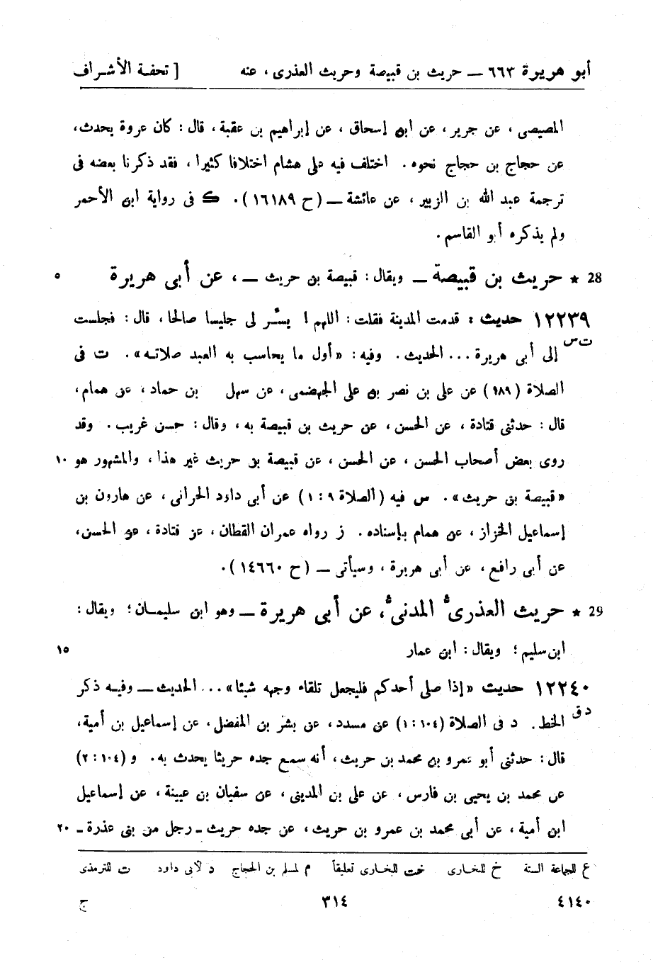 12239 -[ت س] حديث: قدمت المدينة فقلت: اللهم! يسِّر لي جليساً صالحاً، قال: فجلست إلى أبي هريرة ... الحديث. وفيه: أول ما يحاسب به العبد صلاته.