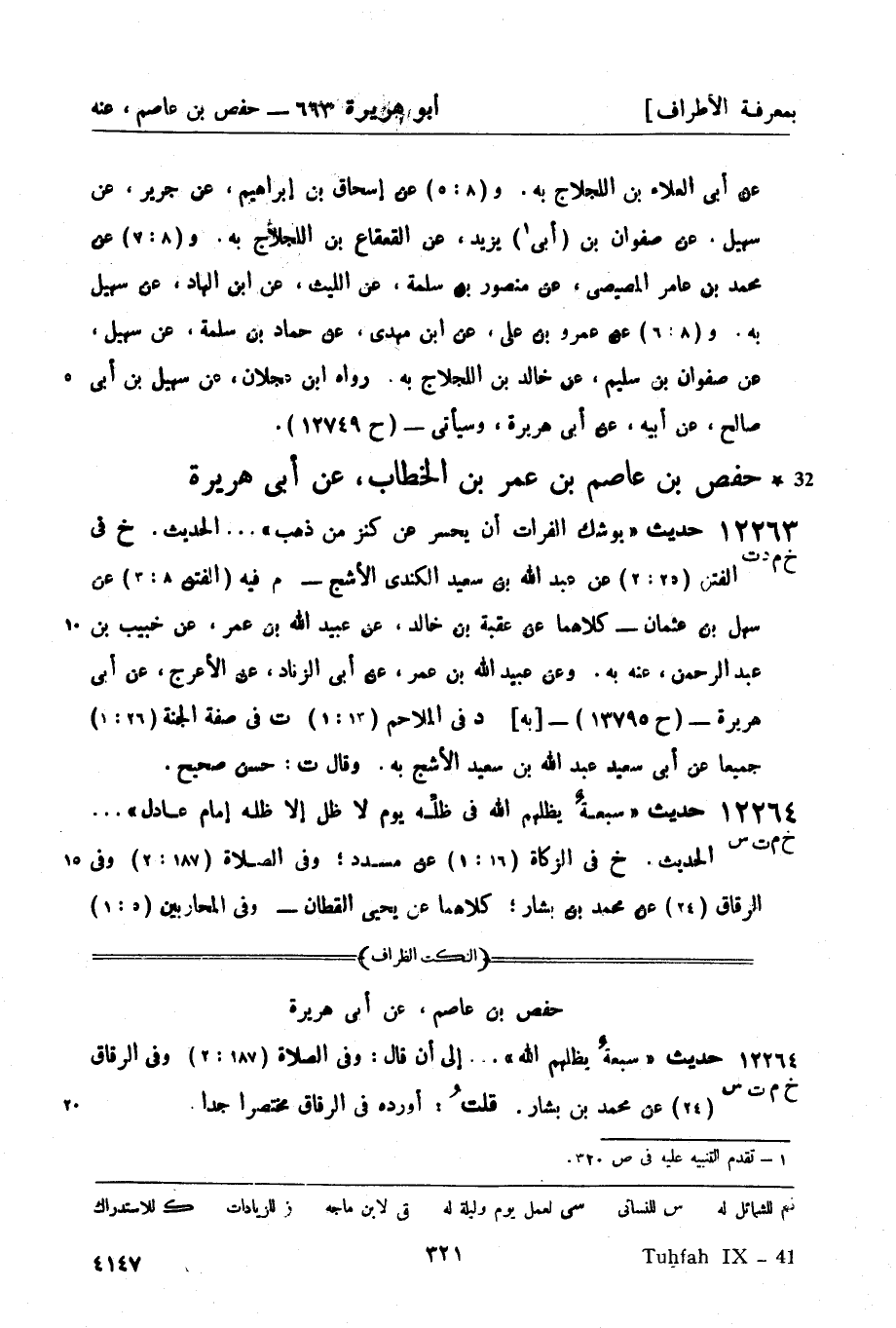 12264 -[خ م ت س] حديث سبعةٌ يظلهم الله في ظلِّه يوم لا ظل إلا ظله إمام عادل ... الحديث. خ في الزكاة (16: 1) عن مسدد؛ وفي الصلاة (187: 2) وفي الرقاق (24) عن محمد بن بشار؛ كلاهما عن يحيى القطان وفي المحاربين -[322]- (5: 1) عن محمد بن سلام، عن عبد الله بن المبارك - كلاهما عن عبيد الله بن عمر، عن خبيب بن عبد الرحمن، عنه به. (م) في الزكاة (31: 1) عن زهير بن حرب ومحمد بن المثنى، كلاهما عن يحيى القطان به. (م) في الزكاة (31: 1) عن يحيى بن يحيى، عن مالك، عن خبيب، عن حفص بن عاصم، عن أبي سعيد (ح 3996) أو عن أبي هريرة به. (ت) في الزهد (53: 3) عن سوار بن عبد الله العنبري ومحمد بن مثنى، كلاهما عن يحيى بن سعيد، عن عبيد الله بن عمر - و (53: 2) عن إسحاق بن موسى، عن معن بن عيسى، عن مالك - كلاهما عن خبيب، عن حفص، عن أبي هريرة أو عن سعيد (ح 3996) به، وقال: حسن صحيح. قال: وهكذا روى غير واحد عن مالك وشك فيه. (س) في القضاء (الكبرى 2: 4) (ك) وفي الرقائق (في الكبرى) عن سويد بن نصر، عن عبد الله بن المبارك به. (ك الرقائق لم يذكره أبو القاسم [1.