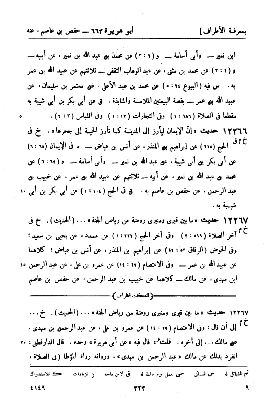خ في آخر الصلاة (519: 2) وفي آخر الحج (222: 1) عن مسدد، عن يحيى بن سعيد؛ وفي الحوض (الرقاق 53: 12) عن إبراهيم بن المنذر، عن أنس بن عياض؛ كلاهما عن عبيد الله بن عمر - وفي الاعتصام (17: 14) عن عمرو بن علي، عن عبد الرحمن بن مهدي، عن مالك - كلاهما عن خبيب بن عبد الرحمن، عن حفص بن عاصم -[324]- به.