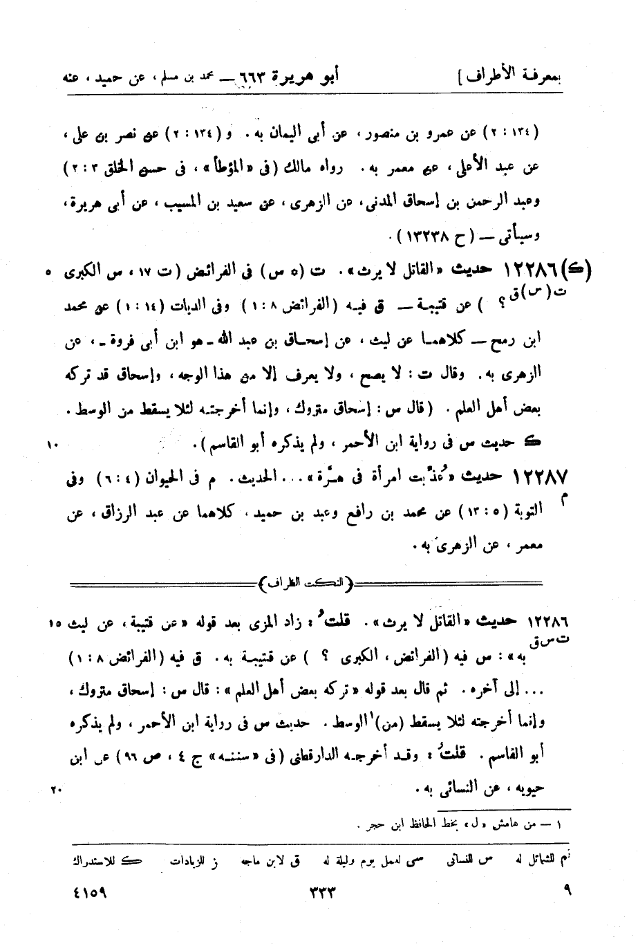 12286 - (ت (س) ق) حديث القاتل لا يرث. (ت) ((ك) س) في الفرائض (ت 17 س الكبرى؟) عن قتيبة (ق) - فيه (الفرائض 8: 1) وفي الديات (14: 1) عن محمد بن رمح - كلاهما عن ليث، عن إسحاق بن عبد الله - هو ابن أبي فروة -، عن الزهري به. وقال (ت) : لا يصح ولا يعرف إلا من هذا الوجه، وإسحاق قد تركه بعض أهل العلم. (قال س: إسحاق متروك وإنما أخرجته لئلا يسقط من الوسط. ك حديث س في رواية ابن الأحمر، ولم يذكره أبو القاسم) .