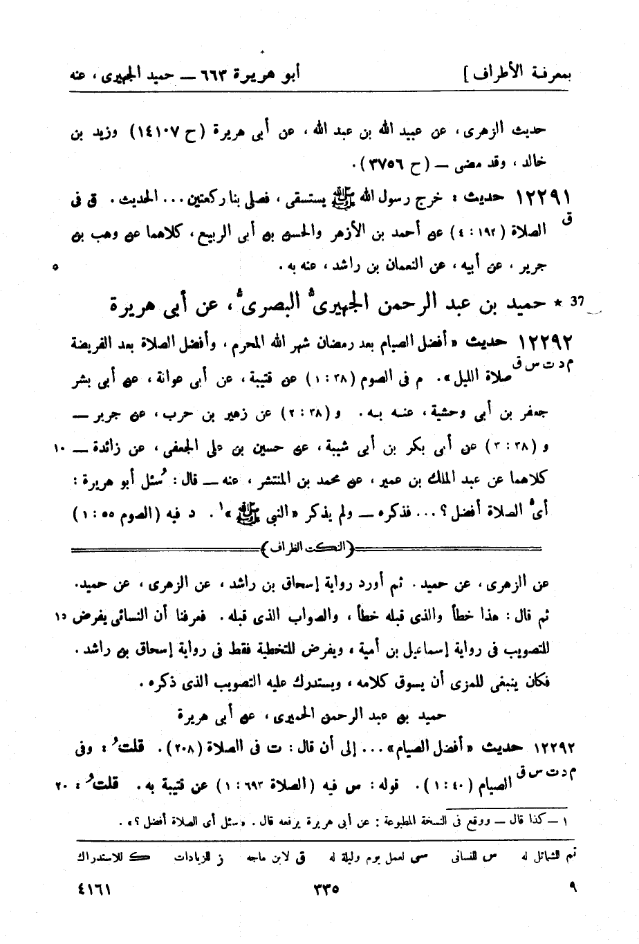 س فيه (الصلاة 693: 1) عن قتيبة به. و (693: 2) عن سويد بن نصر، عن عبد الله، عن شعبة، عن أبي بشر، عن حميد بن عبد الرحمن قال: قال رسول الله صَلَّى اللَّهُ عَلَيْهِ وَسَلَّمَ ... فذكره مرسلاً وفي الصوم1 (الكبرى 73: 3) عن عمرو بن علي، عن عبد الرحمن، عن زائدة به. و (73: 2) عن محمد بن قدامة، عن جرير - بقصة الصوم حسب. وأعاد فيه (الصيام 73: 4) حديث قتيبة كذلك.