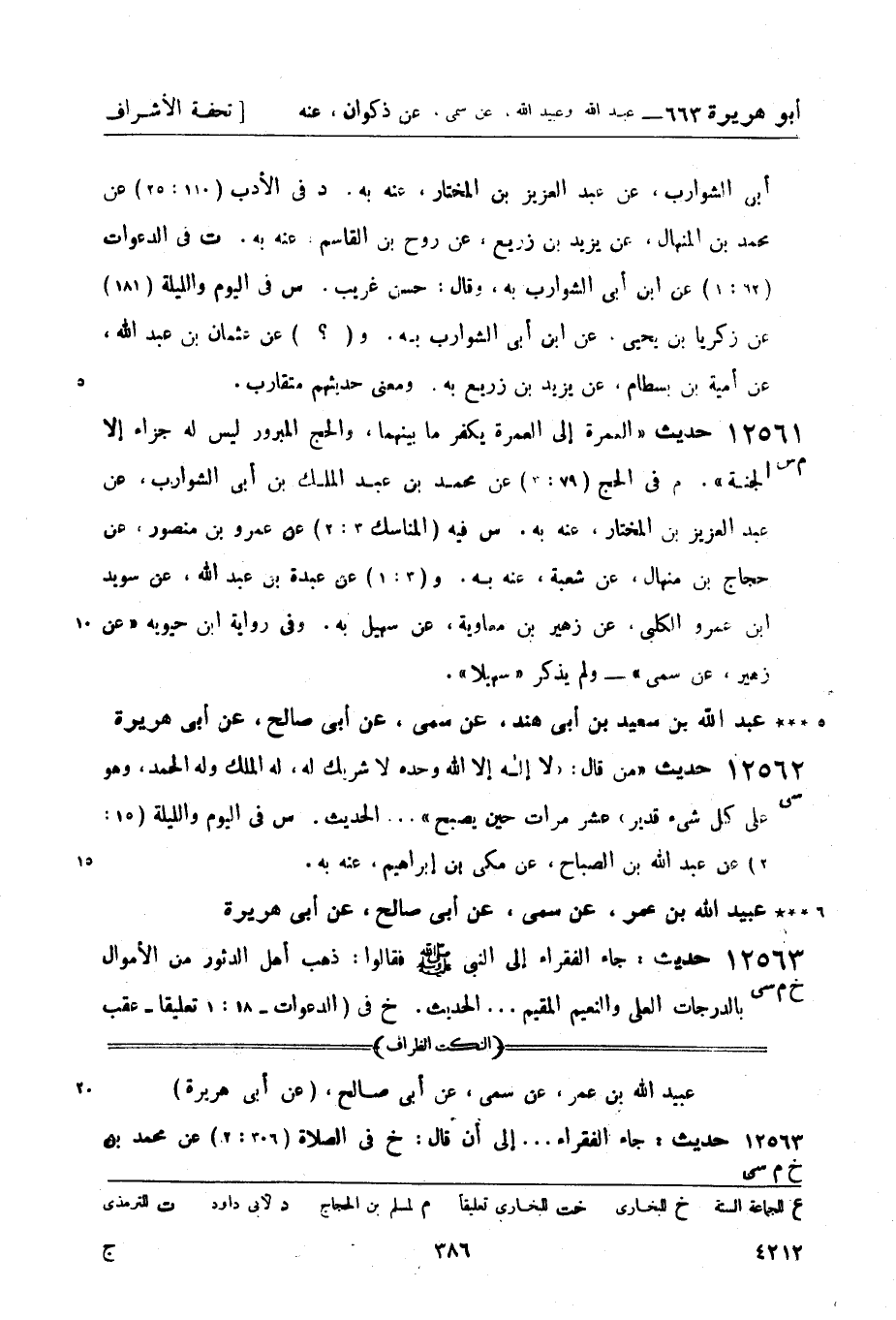 12563 -[خ م سي] حدث: جاء الفقراء إلى النبي صَلَّى اللَّهُ عَلَيْهِ وَسَلَّمَ فقالوا: ذهب أهل الدثور من الأموال بالدرجات العلى والنعيم المقيم.... الحديث. خ في (الدعوات - 18: 1 تعليقاً - عقب -[387]- رواية ورقاء - ح 12584 - تابعه عبيد الله بن عمر به. وفي) الصلاة (306: 2) عن محمد بن أبي بكر - م فيه (الصلاة 79: 14) عن عاصم بن النضر - س في اليوم والليلة (57: 5) عن محمد بن عبد الأعلى - ثلاثتهم عن معتمر بن سليمان، عنه به.