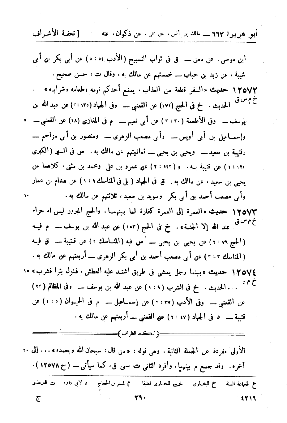 12572 -[خ م س ق] حديث السفر قطعة من العذاب، يمنع أحدكم نومه وطعامه وشرابه.... الحديث. خ في الحج (171) عن القعنبي - وفي الجهاد (135: 3) عن عبد الله بن يوسف - وفي الأطعمة (30: 3) عن أبي نعيم - م في المغازي (28) عن القعنبي - وإسماعيل بن أبي أويس - وأبي مصعب الزهري - ومنصور بن أبي مزاحم - وقتيبة بن سعيد - ويحيى بن يحيى - ثمانيتهم عن مالك به. س في السير (الكبرى 123: 1) عن قتيبة به. و (123: 2) عن عمرو بن علي ومحمد بن مثنى، كلاهما عن يحيى بن سعيد، عن مالك به. ق في الجهاد (بل في المناسك1: 1) عن هشام بن عمار وأبي مصعب أحمد بن أبي بكر وسويد بن سعيد، ثلاثتهم عن مالك به.
