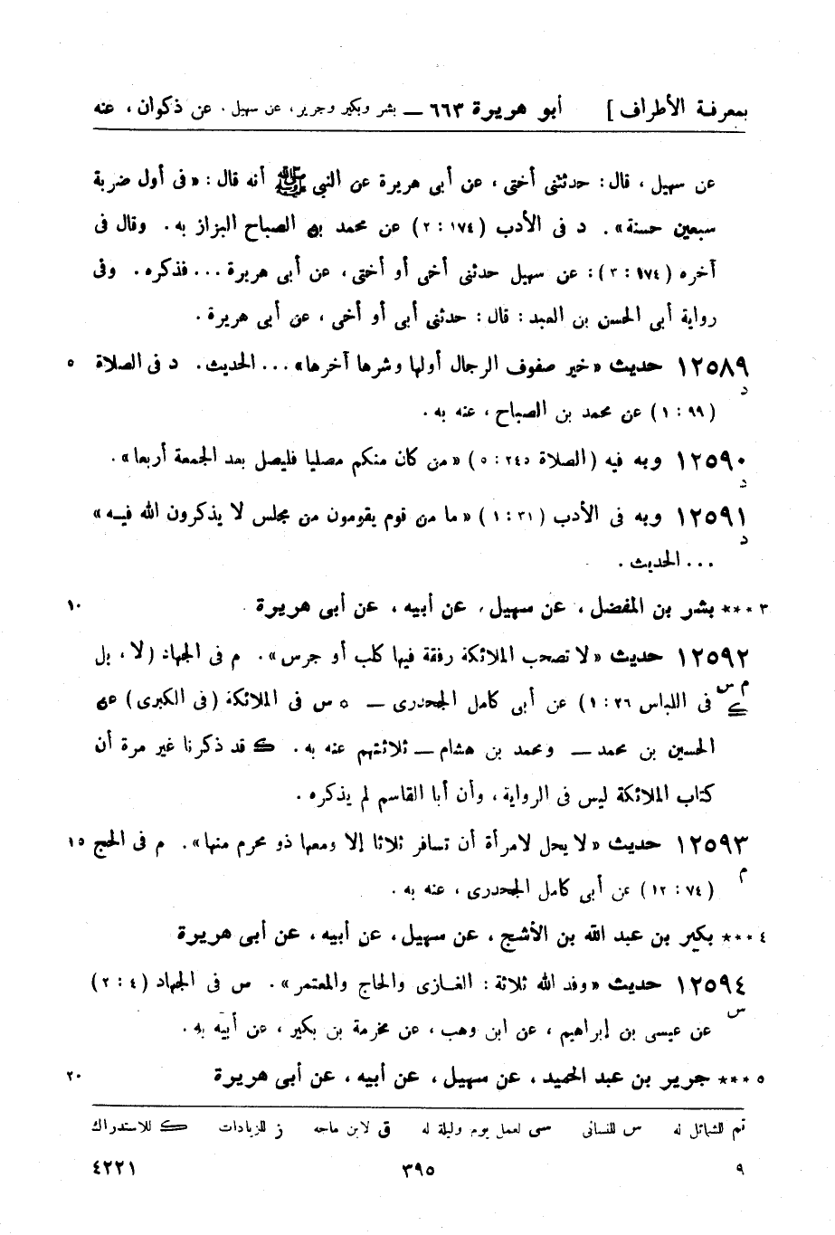 12592 -[م س] حديث لا تصحب الملائكة رفقة فيها كلب أو جرس. م في الجهاد (لا، بل في اللباس 26: 1) عن أبي كامل الجحدري - ك س في الملائكة (في الكبرى) عن الحسين بن محمد - ومحمد بن هشام - ثلاثتهم عنه به. ك قد ذكرنا عير مرة أن كتاب الملائكة ليس في الرواية، وأن أبا القاسم لم يذكره.