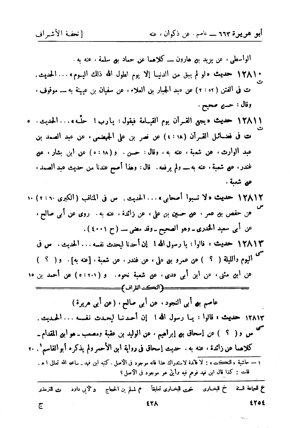 12812 -[س] حديث لا تسبوا أصحابي.... الحديث. س في المناقب (الكبرى 60: 2) عن حفص بن عمر، عن حسين بن علي، عن زائدة، عنه به. روى عن أبي صالح، عن أبي سعيد الخدري - وهو الصحيح - وقد مضى - (ح 4001) .