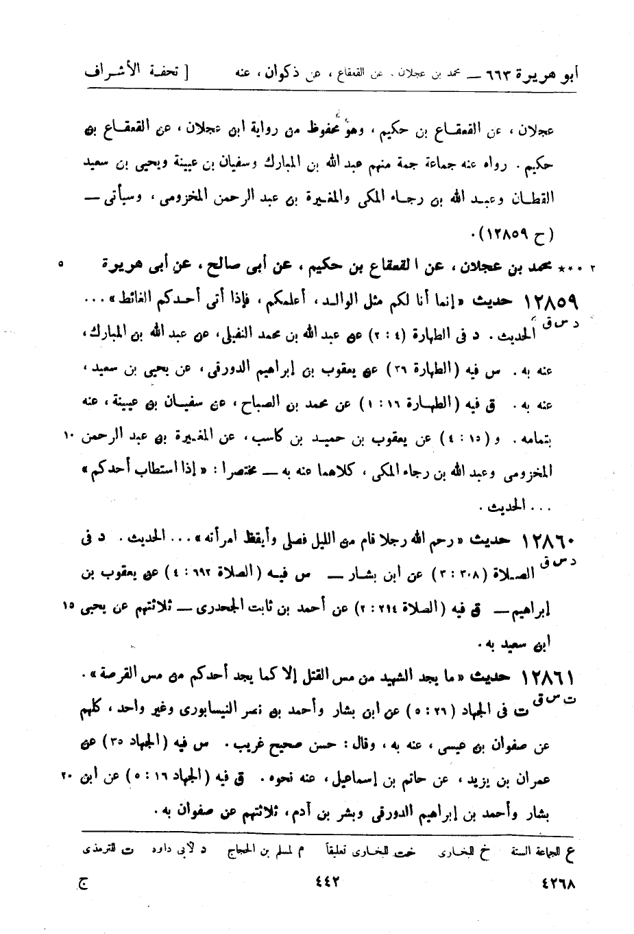 12859 -[د س ق] حديث إنما أنا لكم مثل الوالد، أعلمكم، فإذا أتى أحدكم الغائط.... الحديث. د في الطهارة (4: 2) عن عبد الله بن محمد النفيلي، عن عبد الله بن المبارك، عنه به. س فيه (الطهارة 26) عن يعقوب بن إبراهيم الدورقي، عن يحيى بن سعيد، عنه به. ق فيه (الطهارة 16: 1) عن محمد بن الصباح، عن سفيان بن عيينة، عنه بتمامه. و (15: 4) عن يعقوب بن حميد بن كاسب، عن المغيرة بن عبد الرحمن المخزومي وعبد الله بن رجاء المكي، كلاهما عنه به - مختصراً: إذا استطاب أحدكم.... الحديث.