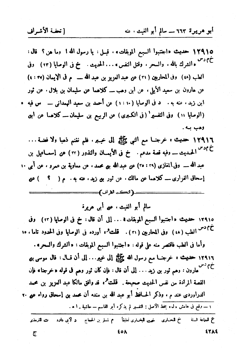 12915 -[خ م د س] حديث اجتنبوا السبع الموبقات، قيل: يا رسول الله! وما هن؟ قال: الشرك بالله، والسحر، وقتل النفس.... الحديث. خ في الوصايا (23) وفي الطب (48) وفي المحاربين (31) عن عبد العزيز بن عبد الله - م في الإيمان (27: 4) عن هارون بن سعيد الأيلي، عن ابن وهب - كلاهما عن سليمان بن بلال، عن ثور بن زيد، عنه به. د في الوصايا (10: 1) عن أحمد بن سعيد الهمداني - س فيه (الوصايا 11) وفي التفسير1 (في الكبرى) عن الربيع بن سليمان - كلاهما عن ابن وهب به.
