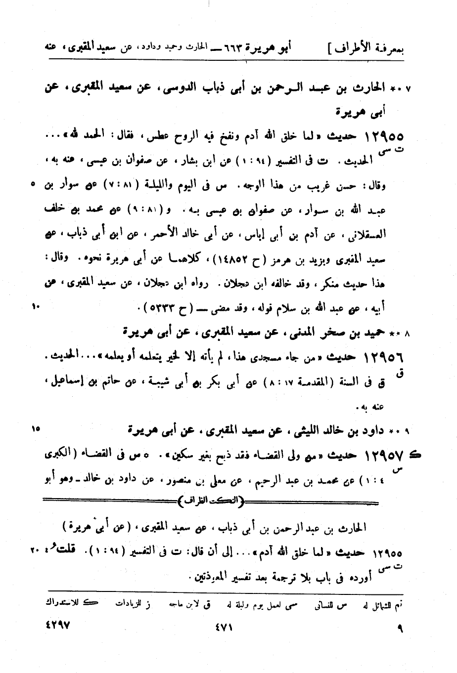 12955 -[ت سي] حديث لما خلق الله آدم ونفخ فيه الروح عطس، فقال: الحمد لله.... الحديث. ت في التفسير (94: 1) عن ابن بشار، عن صفوان بن عيسى، عنه به، وقال: حسن غريب من هذا الوجه. س في اليوم والليلة (81: 7) عن سوار بن عبد الله بن سوار، عن صفوان بن عيسى به. و (81: 9) عن محمد بن خلف العسقلاني، عن آدم بن أبي إياس، عن أبي خالد الأحمر، عن ابن أبي ذباب، عن سعيد المقبري ويزيد بن هرمز (ح 14852) ، كلاهما عن أبي هريرة نحوه، وقال: هذا حديث منكر، وقد خالفه ابن عجلان. رواه ابن عجلان، عن سعيد المقبري، عن أبيه، عن عبد الله بن سلام قوله، وقد مضى - (ح 5333) .