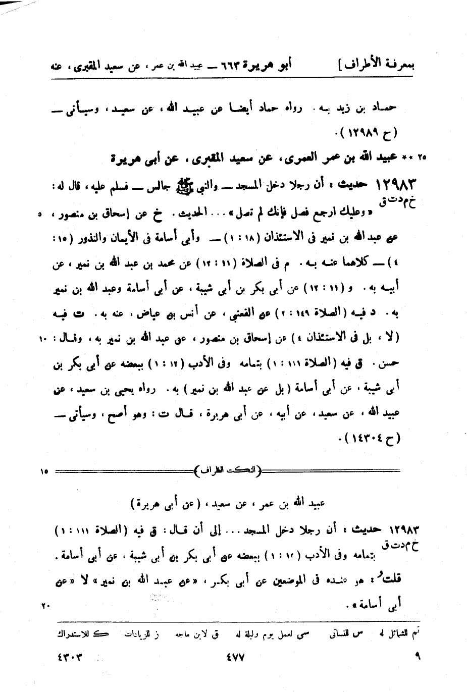 12983 -[خ م د ت ق] حديث: أن رجلاً دخل المسجد - والنبي صَلَّى اللَّهُ عَلَيْهِ وَسَلَّمَ جالس - فسلم عليه، قال له: وعليك ارجع فصل فإنك لم تصل.... الحديث. خ عن إسحاق بن منصور، عن عبد الله بن نمير في الاستئذان (18: 1) - وأبي أسامة في الأيمان والنذور (15: 4) - كلاهما عنه به. م في الصلاة (11، 12) عن محمد بن عبد الله بن نمير، عن أبيه به. و (11: 12) عن أبي بكر بن أبي شيبة، عن أبي أسامة وعبد الله بن نمير به. د فيه (الصلاة 149: 2) عن القعنبي، عن أنس بن عياض، عنه به. ت فيه (لا، بل في الاستئذان 4) عن إسحاق بن منصور، عن عبد الله بن نمير به. وقال: حسن. ق فيه (الصلاة 111: 1) بتمامه وفي الأدب (12: 1) ببعضه عن أبي بكر بن أبي شيبة، عن أبي أسامة (بل عن عبد الله بن نمير) به. رواه يحيى بن سعيد، عن عبيد الله، عن سعيد، عن أبيه، عن أبي هريرة، قال ت: وهو أصح، وسيأتي - (ح 14304) .