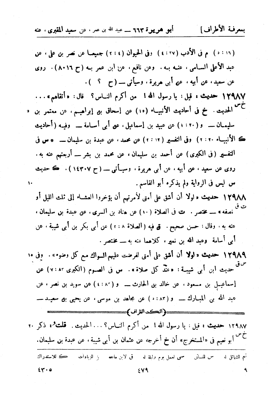 12987 -[خ س] حديث: قيل: يا رسول الله! من أكرم الناس؟ قال: أتقاهم ... الحديث. خ في أحاديث الأنبياء (15) عن إسحاق بن إبراهيم، عن معتمر بن سليمان - و (20: 1) عن عبيد بن إسماعيل، عن أبي أسامة - وفيه (أحاديث الأنبياء 20: 2) وفي التفسير (12: 2) عن محمد، عن عبدة بن سليمان - ك س في التفسير (في الكبرى) عن أحمد بن سليمان، عن محمد بن بشر - أربعتهم عنه به. روى عن سعيد، عن أبيه، عن أبي هريرة، وسيأتي - (ح 14307) . ك حديث س ليس في الرواية ولم يذكره أبو القاسم.