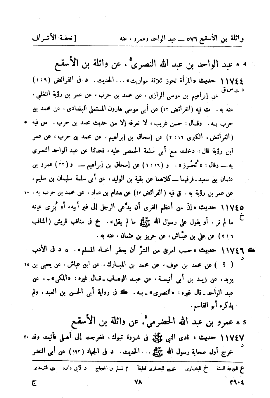ت فيه (الفرائض 23) عن أبي موسى هارون المستملي البغدادي، عن محمد بن حرب به. وقال: حسن غريب، لا نعرفه إلا من حديث محمد بن حرب. س فيه (الفرائض، الكبرى 16: 2) عن إسحاق بن إبراهيم، عن محمد بن حرب، عن عمر بن رؤبة قال: دخلت مع أبي سلمة الحمصي عليه، فحدثنا عن عبد الواحد النصري به - وقال: تُحْرز. و (16: 1) عن إسحاق بن إبراهيم - و (33) عمرو بن عثمان بن سعيد - فرقهما - كلاهما - عن بقية بن الوليد، عن أبي سلمة سليمان بن سليم، عن عمر بن رؤبة به.