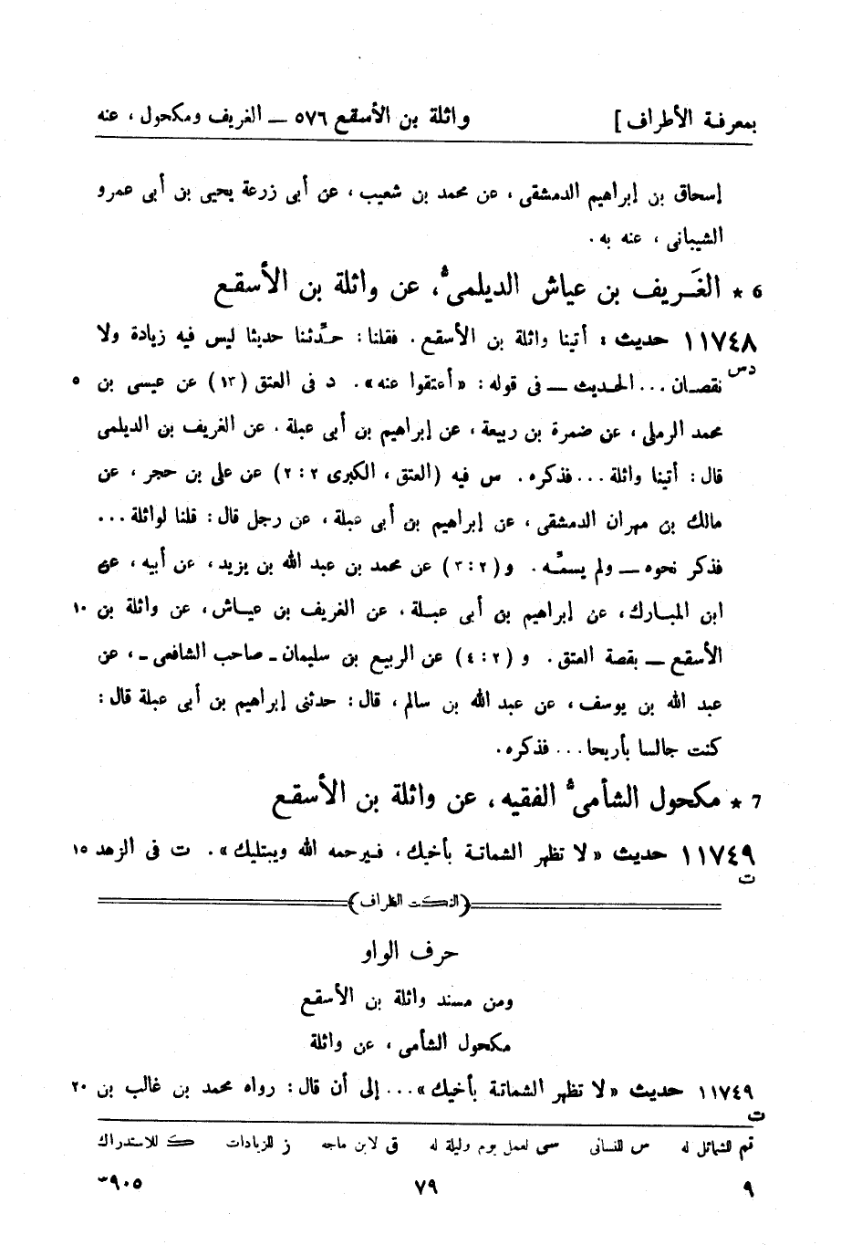 د في العتق (13) عن عيسى بن محمد الرملي، عن ضمرة بن ربيعة، عن إبراهيم بن أبي عبلة، عن الغريف بن الديلمي قال: أتينا واثلة ... فذكره. س فيه (العتق، الكبرى 2: 2) عن علي بن حجر، عن مالك بن مهران الدمشقي، عن إبراهيم بن أبي عبلة، عن رجل قال: قلنا لواثلة ... فذكر نحوه - ولم يسمِّه. و (2: 3) عن محمد بن عبد الله بن يزيد، عن أبيه، عن ابن المبارك، عن إبراهيم بن أبي عبلة، عن الغريف بن عياش، عن واثلة بن الأسقع - بقصة العتق. و (2: 4) عن الربيع بن سليمان - صاحب الشافعي -، عن عبد الله بن يوسف، عن عبد الله بن سالم، قال: حدثني إبراهيم بن أبي عبلة قال: كنت جالساً بأربحا ... فذكره.