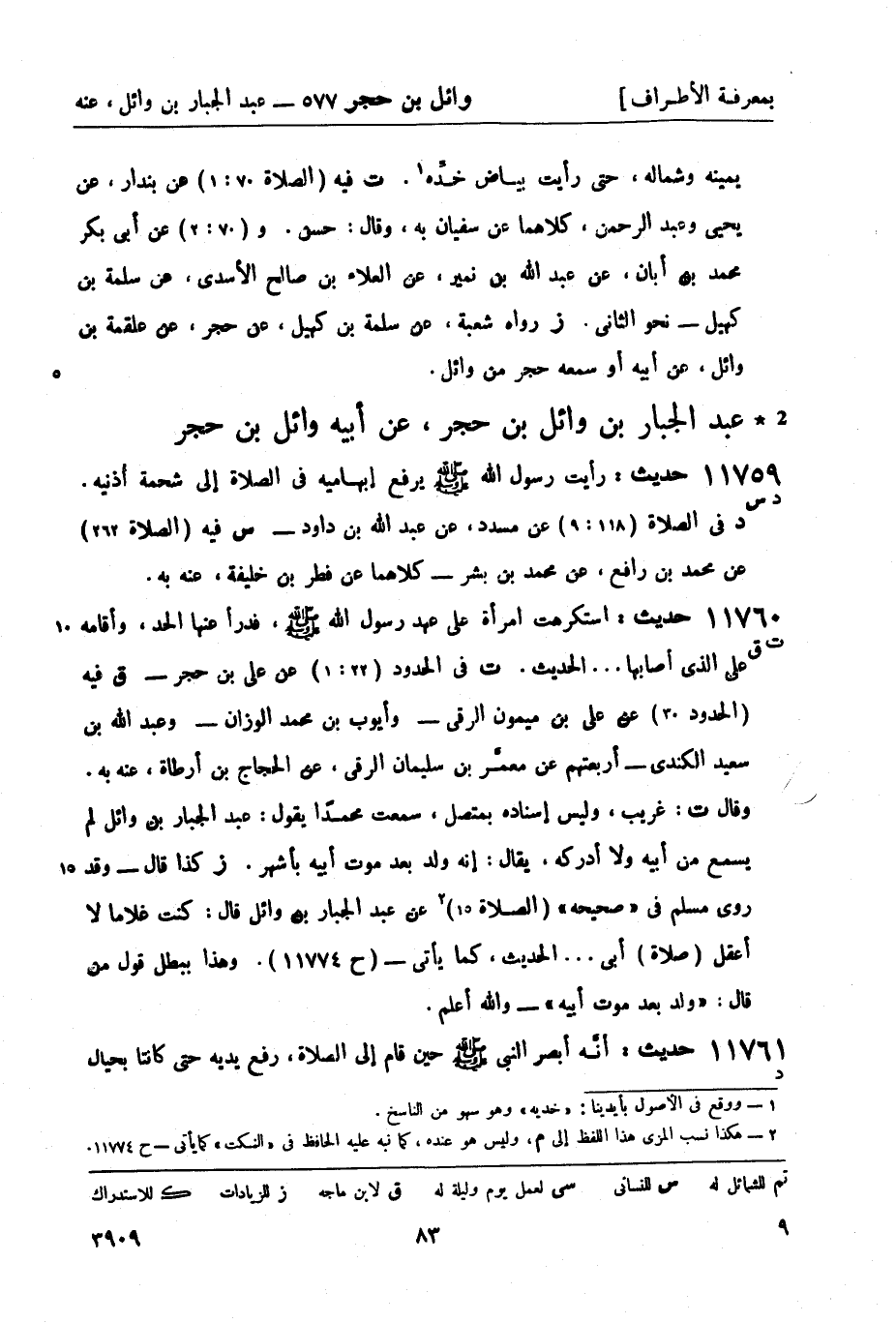 ت: غريب، وليس إسناده بمتصل، سمعت محمداً يقول: عبد الجبار بن وائل لم يسمع من أبيه ولا أدركه، يقال: إنه ولد بعد موت أبيه بأشهر. (ز) كذا قال - وقد روى مسلم في صحيحه (الصلاة 15) 2 عن عبد الجبار بن وائل قال: كنت غلاما لا أعقل (صلاة) أبي ... الحديث، كما يأتي - (ح 11774) . وهذا ببطل قول من قال: ولد بعد موت أبيه - والله أعلم.