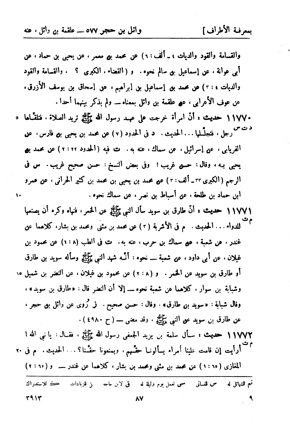 ت في الطب (8: 1) عن محمود بن غيلان، عن أبي داود، عن شعبة - نحوه: أنَّه شهد النبي صَلَّى اللَّهُ عَلَيْهِ وَسَلَّمَ وسأله سويد بن طارق أو طارق بن سويد عن الخمر. و (8: 2) عن محمود بن غيلان، عن النضر بن شميل وشبابة بن سوار، كلاهما عن شعبة نحوه - إلا أن النضر قال: طارق بن سويد وقال شبابة: سويد بن طارق. وقال: حسن صحيح. (ز) رُوي عن وائل بن حجر، عن طارق بن سويد عن النبيّ صَلَّى اللَّهُ عَلَيْهِ وَسَلَّمَ، وقد مضى - (ح 4980) .
