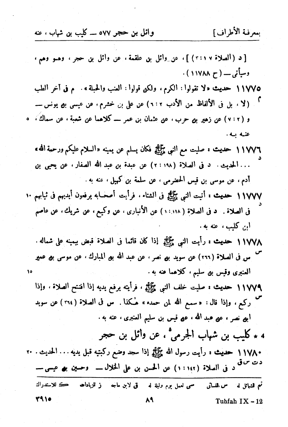11776 -[د] حديث: صليت مع النبي صَلَّى اللَّهُ عَلَيْهِ وَسَلَّمَ فكان يسلم عن يمينه السلام عليكم ورحمة الله ... الحديث.