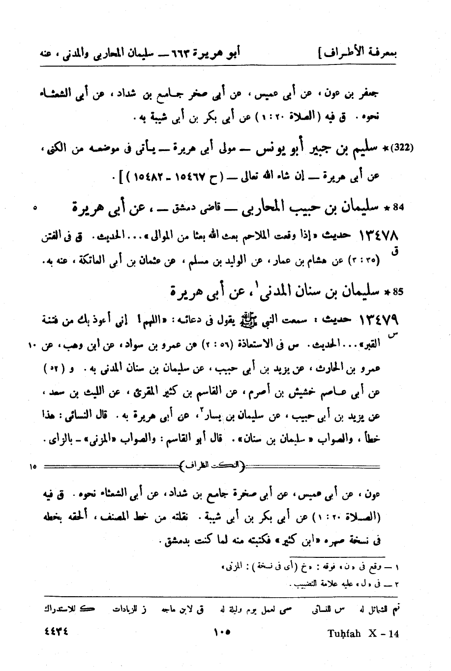 س في الاستعاذة (56: 2) عن عمرو بن سواد، عن ابن وهب، عن عمرو بن الحارث، عن يزيد بن أبي حبيب، عن سليمان بن سنان المدني به. و (52) عن أبي عاصم خشيش بن أصرم، عن القاسم بن كثير المقرئ، عن الليث بن سعد، عن يزيد بن أبي حبيب، عن سليمان بن يسار2، عن أبي هريرة به. قال النسائي: هذا خطأ، والصواب سليمان بن سنان. قال أبو القاسم: والصواب: المزني - بالزاي.