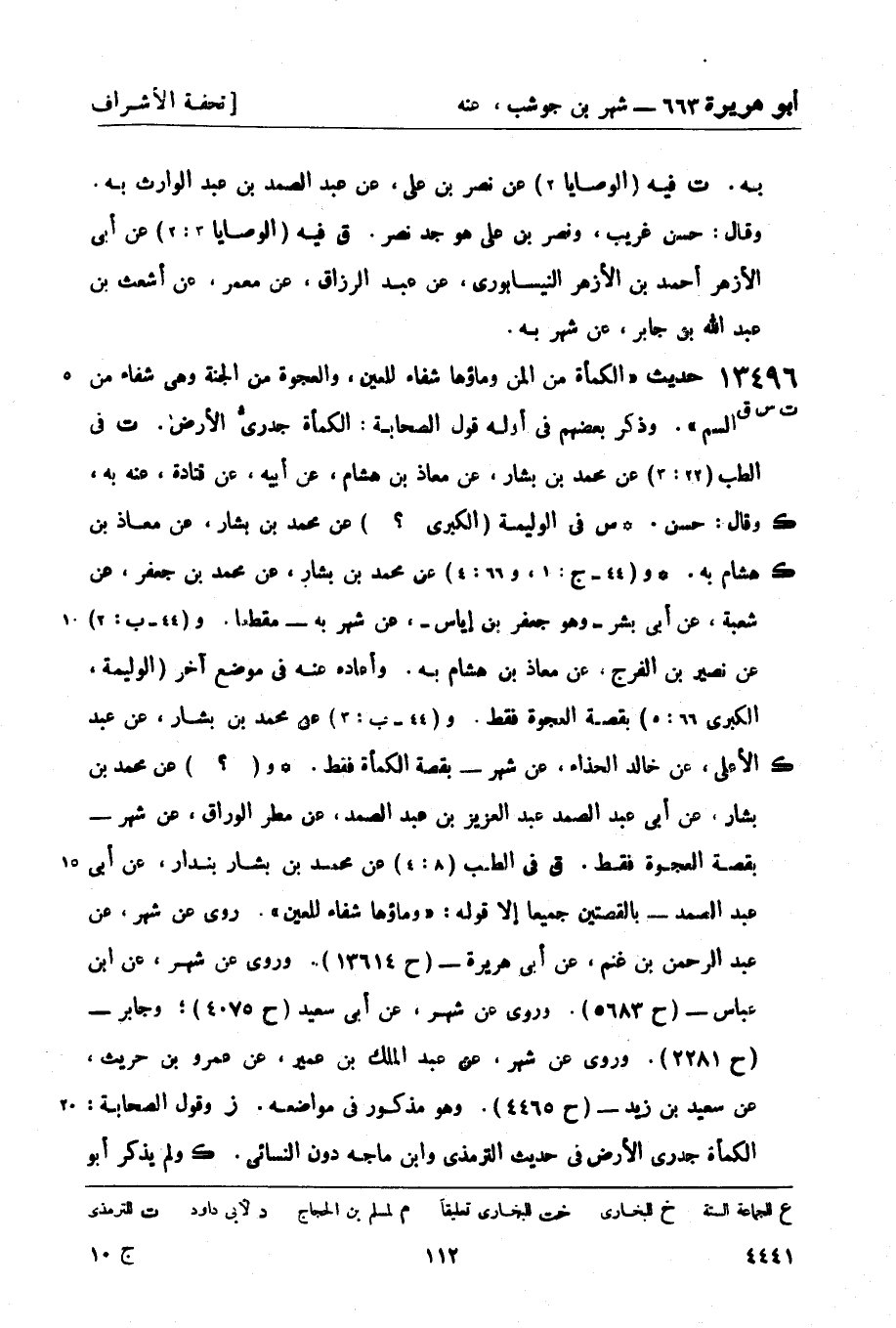ق في الطب (8: 4) عن محمد بن بشار بندار، عن أبي عبد الصمد - بالقصتين جميعاً إلا قوله: وماؤها شفاء للعين. روي عن شهر، عن عبد الرحمن بن غنم، عن أبي هريرة - (ح 13614) . وروي عن شهر، عن ابن عباس - (ح 5683) وروي عن شهر، عن أبي سعيد (ح 4075) ؛ وجابر - (ح 2281) . وروي عن شهر، عن عبد الملك بن عمير، عن عمرو بن حريث، عن سعيد بن زيد - (ح 4465) . وهو مذكور في مواضعه. (ز) وقول الصحابة: الكمأة جدري الأرض في حديث الترمذي وابن ماجه دون النسائي. (ك) ولم يذكر أبو -[113]- القاسم للنسائي إلا حديثه عن نصير بن الفرج في ذكر العجوة فقط وحديثه عن محمد بن بشار، عن عبد الأعلى، ولم يبين ما روي متنه، وما سوى ذلك لم يذكره، والجميع في الرواية. ووقع ذكر الكمأة في حديثه عن محمد بن بشار، عن محمد بن جعفر في رواية سهل بن بشر الإسفرائيني بإسناده عن شهر، عن أبي سعيد وجابر بدل أبي هريرة - وهو خطأ. إنما ذلك في حديث الأعمش، عن جعفر بن إياس، عن شهر، عن أبي سعيد، وهو في كتاب النسائي بعد حديث شعبة.