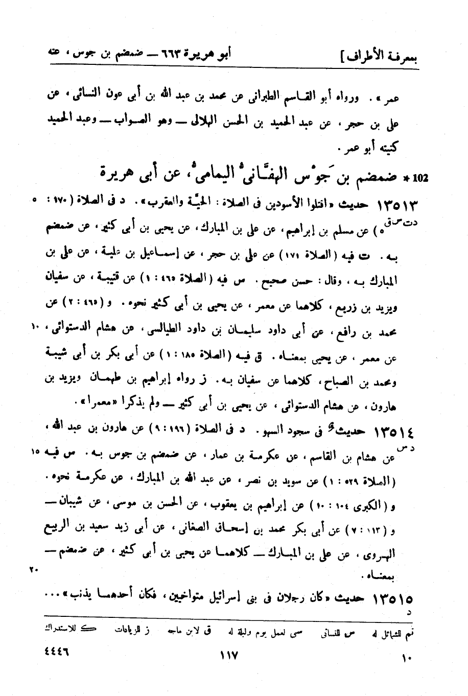 س فيه (الصلاة 529: 1) عن سويد بن نصر، عن عبد الله بن المبارك، عن عكرمة نحوه، و (الكبرى 104: 10) عن إبراهيم بن يعقوب، عن الحسن بن موسى، عن شيبان - و (113: 7) عن أبي بكر محمد بن إسحاق الصغاني، عن أبي زيد سعيد بن الربيع الهروي، عن علي بن المبارك - كلاهما عن يحيى بن أبي كثير، عن ضمضم - بمعناه.