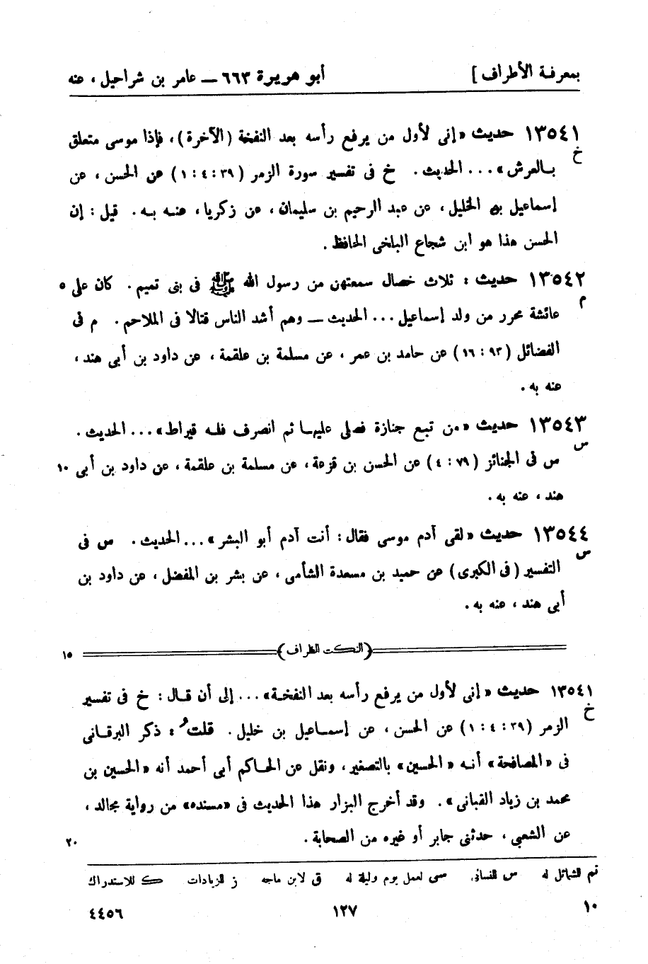 خ في تفسير سورة الزمر (39: 4: 1) عن الحسن، عن إسماعيل بن الخليل، عن عبد الرحيم بن سليمان، عن زكريا، عنه به. قيل: إن الحسن هذا هو ابن شجاع البلخي الحافظ.