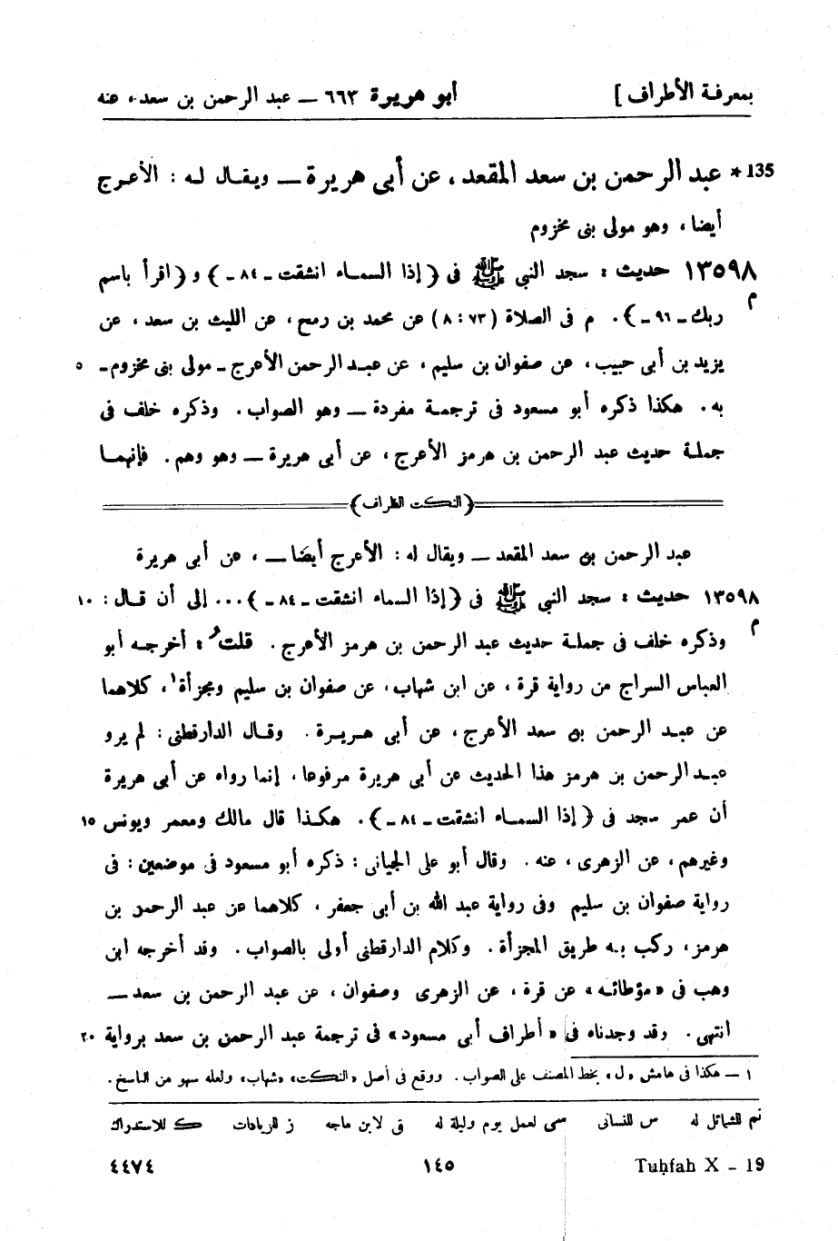 13598 -[م] حديث: سجد النبي صَلَّى اللَّهُ عَلَيْهِ وَسَلَّمَ في إذا السماء انشقت (84) واقرأ باسم ربك. (96) . (م) في الصلاة (73: 8) عن محمد بن رمح، عن الليث بن سعد، عن يزيد بن أبي حبيب، عن صفوان بن سليم، عن عبد الرحمن الأعرج - مولى بني مخزوم - به. هكذا ذكره أبو مسعود في ترجمة مفردة - وهو الصواب. وذكره خلف في جملة حديث عبد الرحمن بن هرمز الأعرج، عن أبي هريرة - وهو وهم. فإنهما -[146]- اثنان: هذا يقال له مولى بني مخزوم، وابن هرمز مولى بني المطلب.