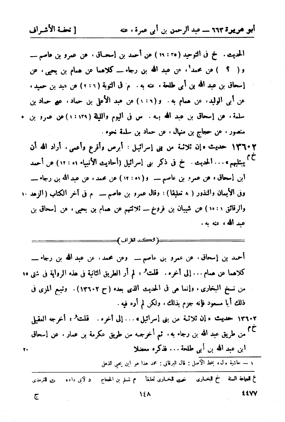 خ في ذكر بني إسرائيل (أحاديث الأنبياء 51: 12) عن أحمد بن إسحاق، عن عمرو بن عاصم - و (51 - 12) عن محمد، عن عبد الله بن رجاء - وفي الأيمان والنذور (8 تعليقاً) : وقال عمرو بن عاصم -
