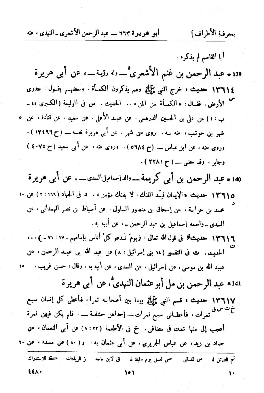 13618 -[خ ت س ق] حديث: قسم النبي صَلَّى اللَّهُ عَلَيْهِ وَسَلَّمَ يوماً بين أصحابه تمراً، فأعطى كل إنسان سبع تمرات، فأعطاني سبع تمرات - إحداهن حشفة -، فلم يكن فيهن تمرة أعجب إلى منها شدت في مضاغي. (خ) في الأطعمة (23: 1) عن أبي النعمان، عن حماد بن زيد، عن عباس الجريرى، عن أبي عثمان به. و (40) عن مسدد، عن -[152]- حماد بن زيد به - مختصراً: قسم بين أصحابه تمراً فأصابني سبع تمرات، إحداهن حشفة. وزاد في أول حديثه: تضيفت أبا هريرة سبعاً فكان هو وامرأته وخادمه يعتقبون الليل أثلاثاً، يصلي هذا ثم يوقظ هذا. و (40: 2) عن محمد بن الصباح، عن إسماعيل بن زكريا، عن عاصم الأحول، عن أبي عثمان - نحوه: قسم بيننا تمراً فأصابني منه خمس، أربع تمرات وحشفة، ثم رأيت الحشفة هي أشدهن لضرسي،