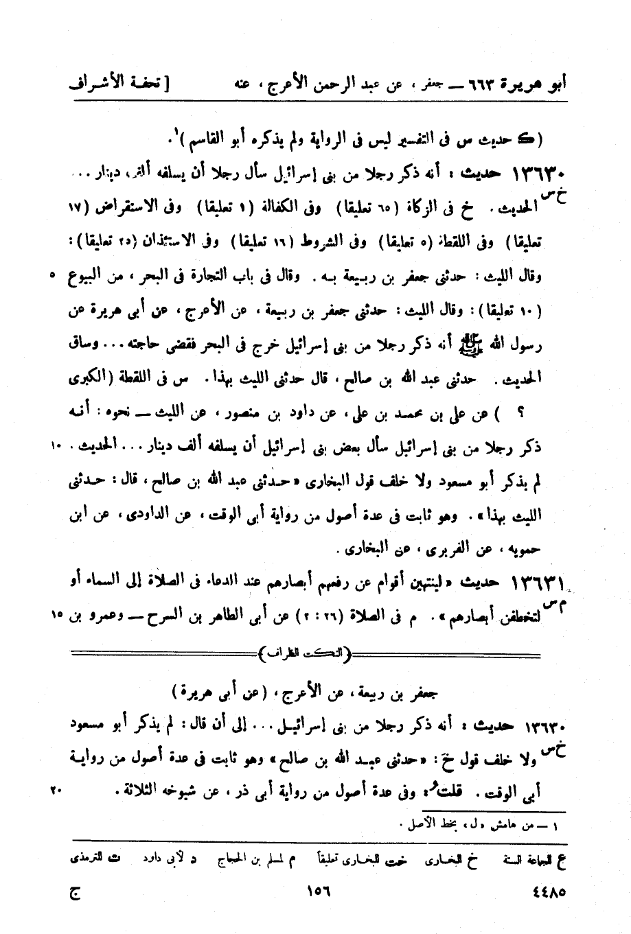 خ في الزكاة (65 تعليقاً) وفي الكفالة (1 تعليقاً) وفي الاستقراض (17 تعليقاً) وفي اللقطة (5 تعليقاً) وفي الشروط (16 تعليقاً) وفي الاستئذان (25 تعليقاً) : وقال الليث: حدثني جعفر بن ربيعة به. وقال في باب التجارة في البحر، من البيوع (10 تعليقاً) : وقال الليث: حدثني جعفر بن ربيعة، عن الأعرج، عن أبي هريرة، عن رسول الله صَلَّى اللَّهُ عَلَيْهِ وَسَلَّمَ أنه ذكر رجلاً من بني إسرائيل خرج في البحر فقضى حاجته ... وساق الحديث. حدثني عبد الله بن صالح، قال حدثني الليث بهذا.