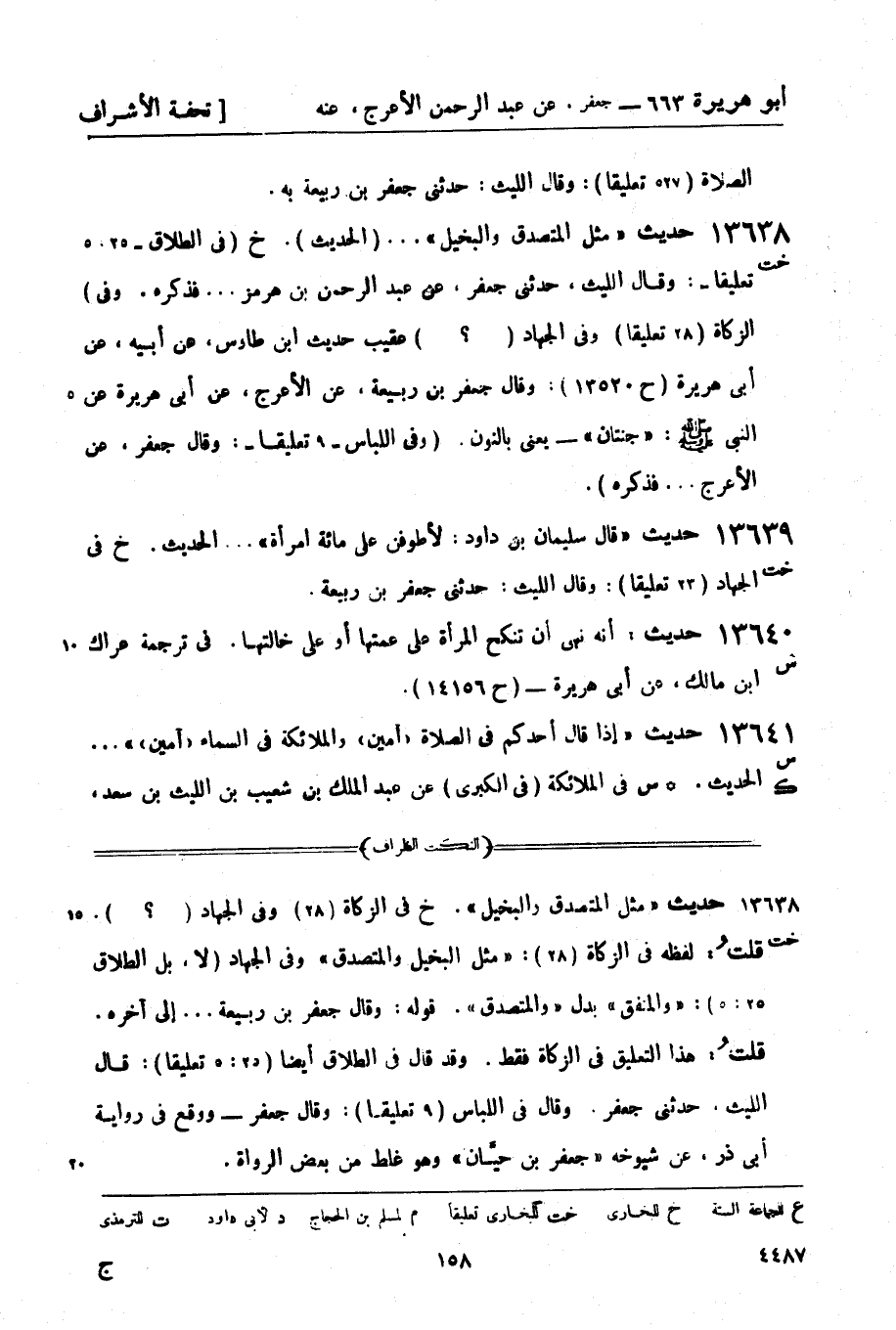 خ (في الطلاق - 25: 5 تعليقاً: وقال الليث، حدثني جعفر، عن عبد الرحمن بن هرمز ... فذكره. وفي) الزكاة (28 تعليقاً) وفي الجهاد (؟) عقيب حديث ابن طاوس، عن أبيه، عن أبي هريرة (ح 13520) : وقال جعفر بن ربيعة، عن الأعرج، عن أبي هريرة عن النبيّ صَلَّى اللَّهُ عَلَيْهِ وَسَلَّمَ: جنتان - يعني بالنون. (وفي اللباس - 9 تعليقاً -: وقال جعفر، عن الأعرج ... فذكره) .