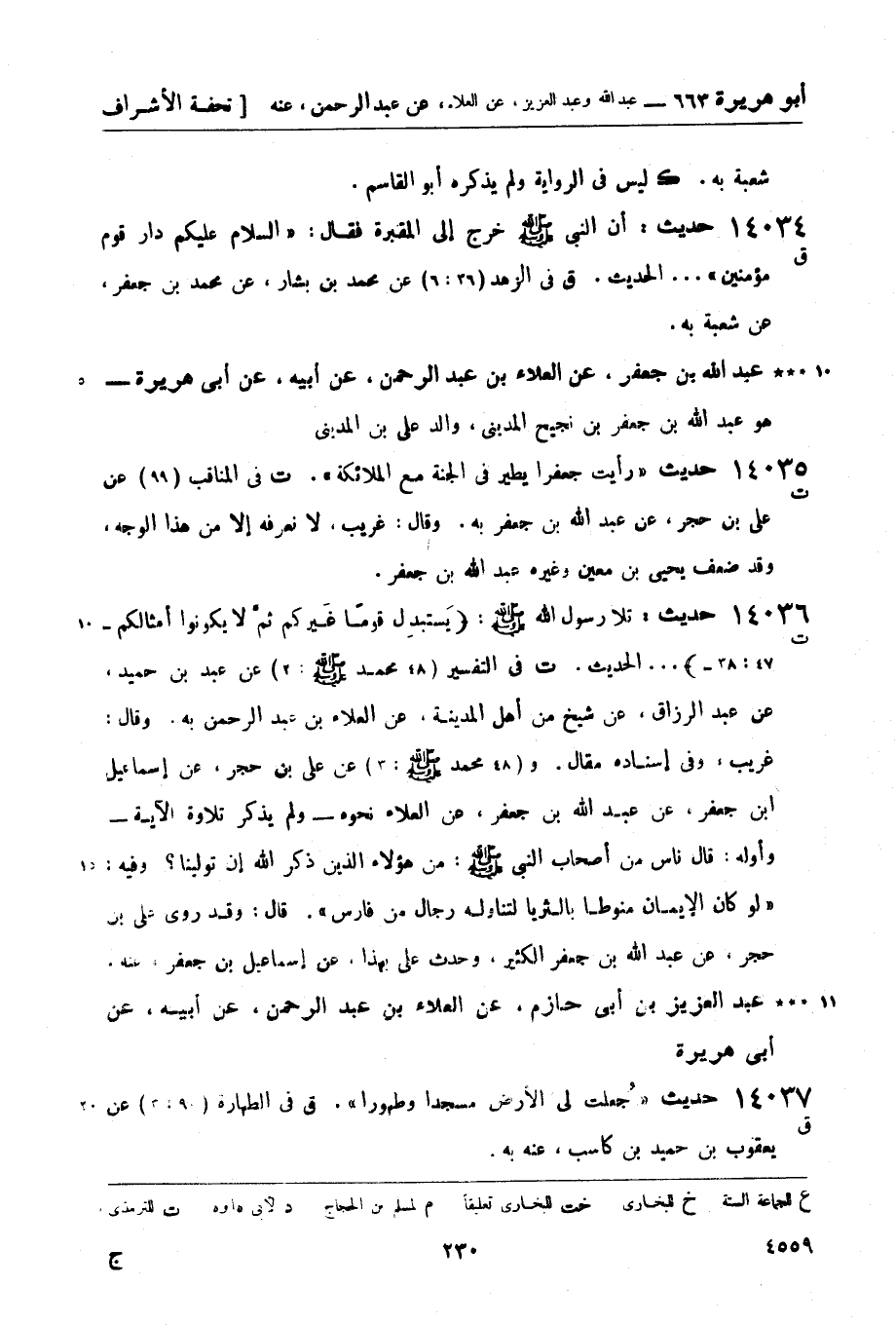 ت في التفسير (48 محمد صَلَّى اللَّهُ عَلَيْهِ وَسَلَّمَ: 2) عن عبد بن حميد، عن عبد الرزاق، عن شيخ من أهل المدينة، عن العلاء بن عبد الرحمن به. وقال: غريب، وفي إسناده مقال. و (48 محمد صَلَّى اللَّهُ عَلَيْهِ وَسَلَّمَ: 3) عن علي بن حجر، عن إسماعيل بن جعفر، عن عبد الله بن جعفر، عن العلاء نحوه - ولم يذكر تلاوة الآية - وأوله: قال ناس من أصحاب النبيّ صَلَّى اللَّهُ عَلَيْهِ وَسَلَّمَ: من هؤلاء الذين ذكر الله إن تولينا؟ وفيه: لو كان الإيمان منوطاً بالثريا لتناوله رجال من فارس. قال: وقد روى علي بن حجر، عن عبد الله بن جعفر الكثير، وحدث علي بهذا، عن إسماعيل بن جعفر، عنه.