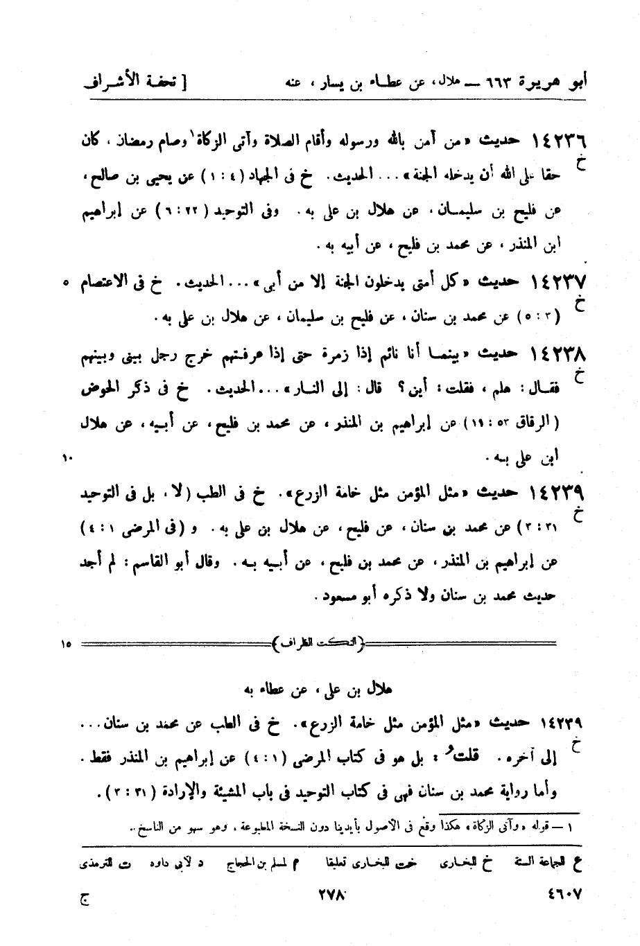 14239 -[خ] حديث مثل المؤمن مثل خامة الزرع. (خ) في الطب (لا، بل في التوحيد 31: 3) عن محمد بن سنان، عن فليح، عن هلال بن علي به. و (في المرضى 1: 4) عن إبراهيم بن المنذر، عن محمد بن فليح، عن أبيه به. وقال أبو القاسم: لم أجد حديث محمد بن سنان ولا ذكره أبو مسعود.