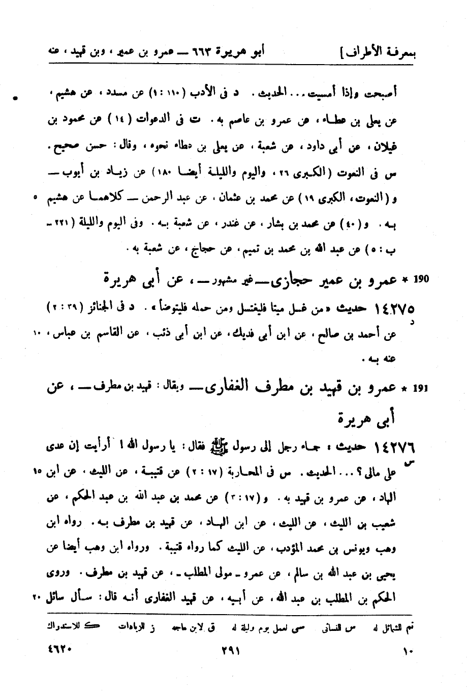 س في المحاربة (17: 2) عن قتيبة، عن الليث، عن ابن الهاد، عن عمرو بن قهيد به. و (17: 3) عن محمد بن عبد الله بن عبد الحكم، عن شعيب بن الليث، عن الليث، عن ابن الهاد، عن قهيد بن مطرف به. رواه ابن وهب ويونس بن محمد المؤدب، عن الليث كما رواه قتيبة. ورواه ابن وهب أيضاً عن يحيى بن عبد الله بن سالم، عن عمرو - مولى المطلب، عن قهيد بن مطرف. وروى الحكم بن المطلب بن عبد الله، عن أبيه، عن قهيد الغفاري أنه قال: سأل سائل -[292]- رسول الله صَلَّى اللَّهُ عَلَيْهِ وَسَلَّمَ ... فذكره - مرسل، ولم يذكر أبا هريرة.