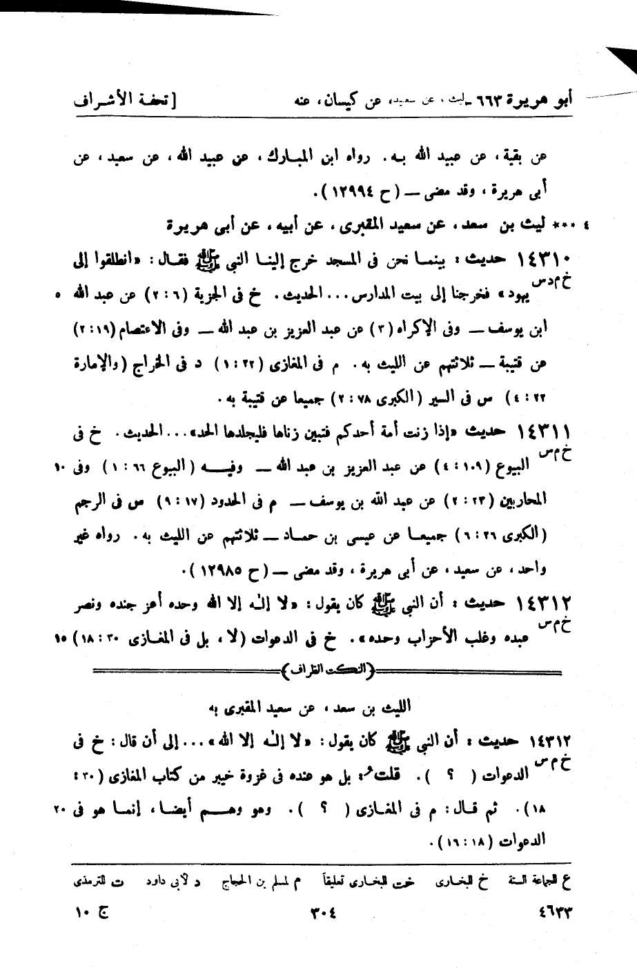 س في الرجم (الكبرى 26: 6) جميعاً عن عيسى بن حماد - ثلاثتهم عن الليث به. رواه غير واحد، عن سعيد، عن أبي هريرة، وقد مضى - (ح 12985) .