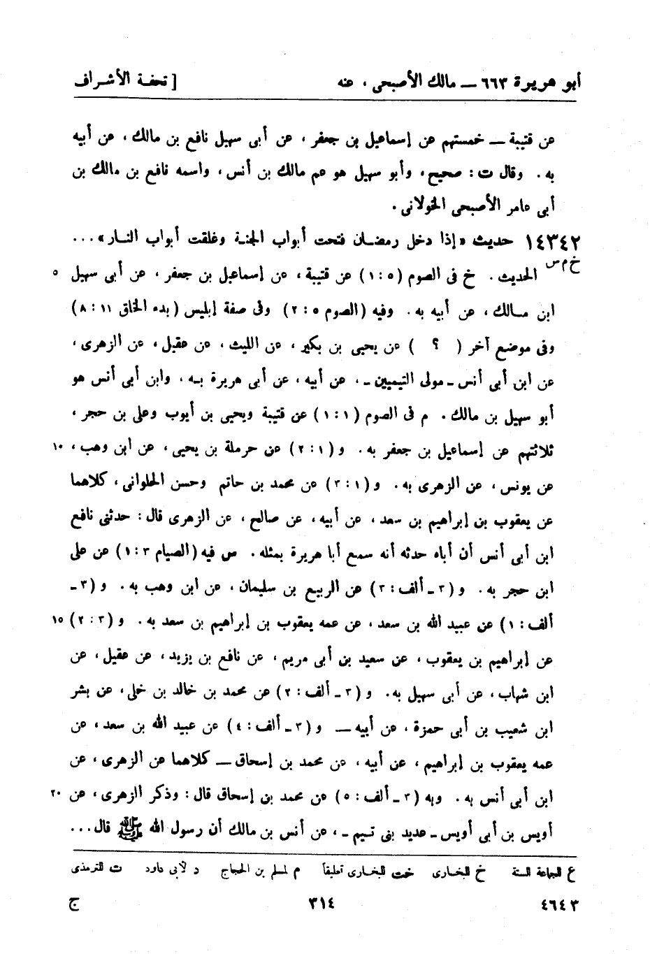 خ في الصوم (5: 1) عن قتيبة، عن إسماعيل بن جعفر، عن أبي سهيل بن مالك، عن أبيه به. وفيه (الصوم 5: 2) وفي صفة إبليس (بدء الخلق 11: 8) وفي موضع آخر (؟) عن يحيى بن بكير، عن الليث، عن عقيل، عن الزهري، عن ابن أبي أنس - مولى التيميين - عن أبيه، عن أبي هريرة به، وابن أبي أنس هو أبو سهيل بن مالك.