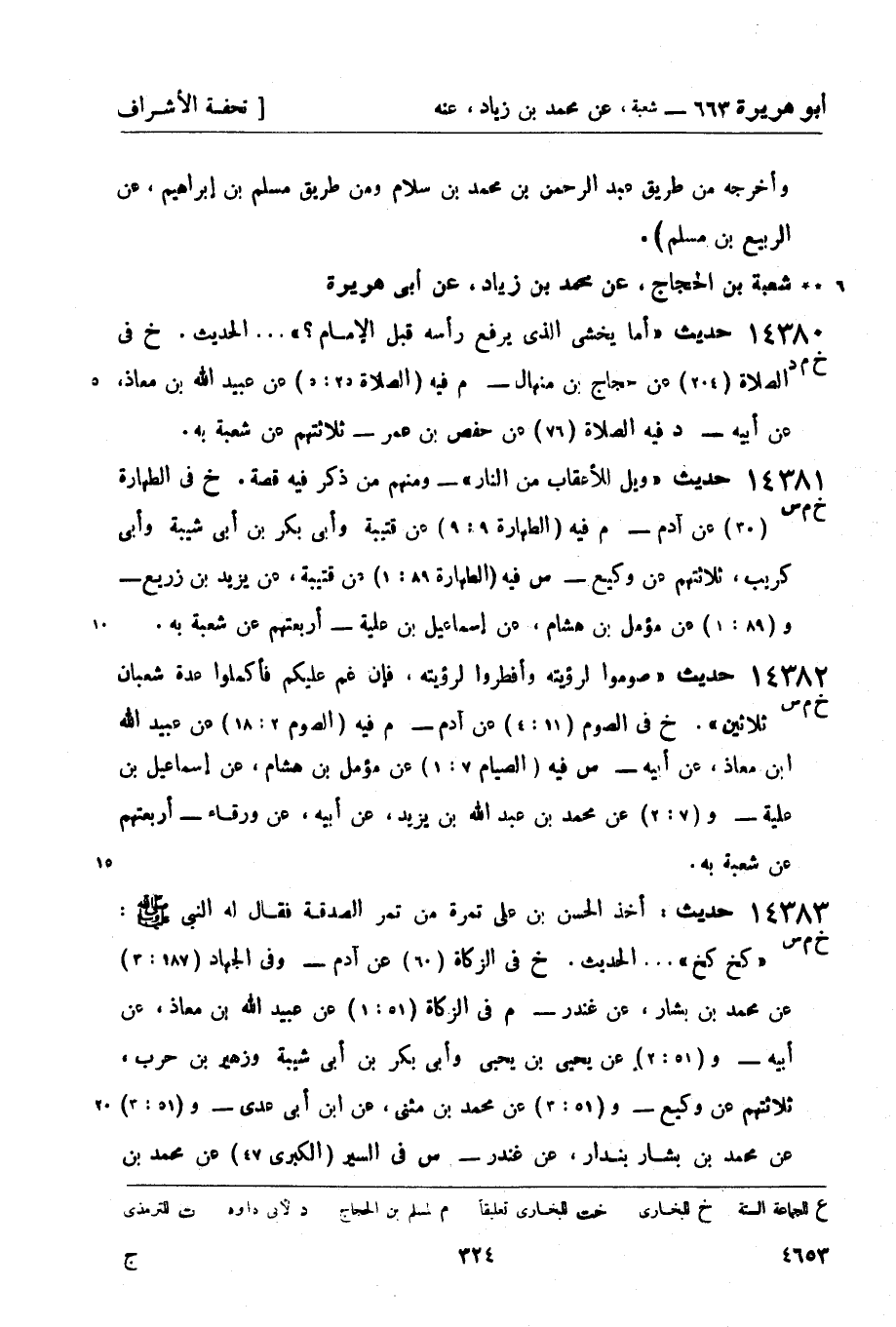 م في الزكاة (51: 1) عن عبيد الله بن معاذ، عن أبيه - و (51: 2) عن يحيى بن يحيى وأبي بكر بن أبي شيبة وزهير بن حرب، ثلاثتهم عن وكيع - و (51: 3) عن محمد بن مثنى، عن ابن أبي عدي - و (51: 3) عن محمد بن بشار بندار، عن غندر - س في السير (الكبرى 47) عن محمد بن -[325]- عبد الأعلى، عن خالد بن الحارث - ستتهم عن شعبة به.