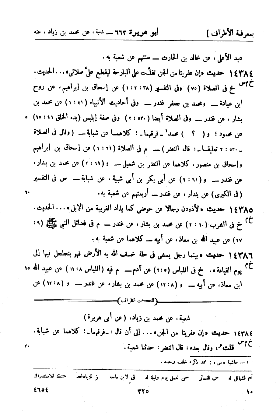 خ في الصلاة (75) وفي التفسير (38: 2: 1) عن إسحاق بن إبراهيم، عن روح بن عبادة - ومحمد بن جعفر غندر - وفي أحاديث الأنبياء (41: 1) عن محمد بن بشار، عن غندر - وفي الصلاة أيضاً (530: 2) وفي صفة إبليس (بدء الخلق 11: 15) عن محمود؛ و (؟) محمد1 - فرقهما -؛ كلاهما عن شبابة - (وقال في الصلاة - 530: 2 تعليقاً -: قال النضر) -