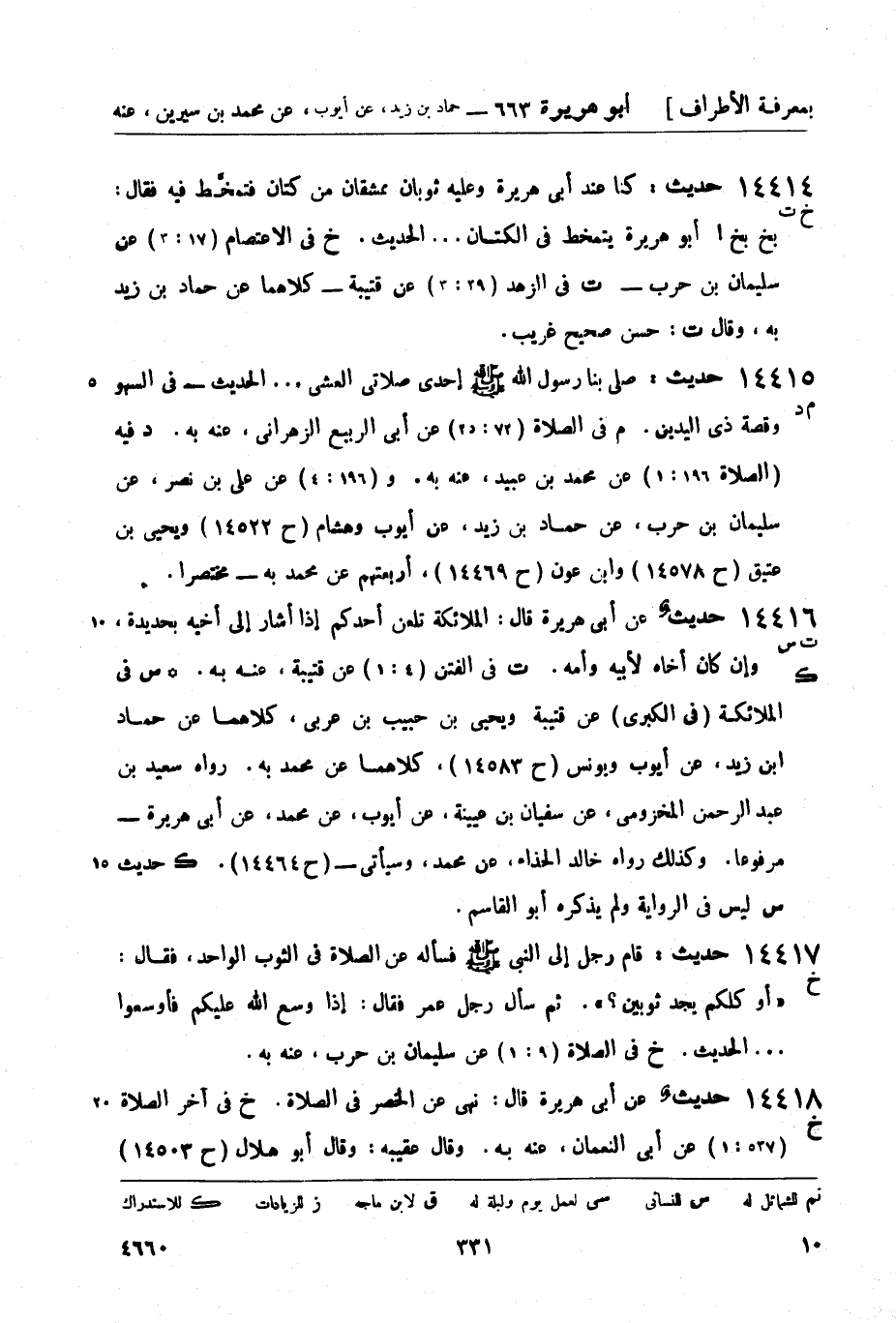 س في الملائكة (في الكبرى) عن قتيبة ويحيى بن حبيب بن عربي، كلاهما عن حماد بن زيد، عن أيوب ويونس (ح 14583) ، كلاهما عن محمد به. رواه سعيد بن عبد الرحمن المخزومي، عن سفيان بن عيينة، عن أيوب، عن محمد، عن أبي هريرة مرفوعاً. وكذلك رواه خالد الحذاء، عن محمد، وسيأتي - (ح 14464) . (ك) حديث